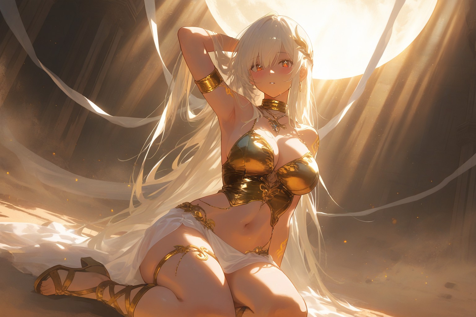 Desert mirage,In the center of the image, a woman with long, white hair is seated on a cliff. Her hair cascades down her shoulders and extends to her elbows. Shes dressed in a braided outfit thats gold in color, and around her neck rests a necklace made of the same material.The setting sun paints the sky in hues of orange, casting an ethereal glow on the scene. The sun is directly behind her, its light illuminating her face and the surrounding landscape.Behind her, the sky transitions from day to night, with shades of blue appearing near the horizon. This gradient effect adds depth to the image, making it seem as if shes at a significant height.The woman appears to be in a state of contemplation, her gaze directed off into the distance. The cliff on which she sits overlooks an unseen landscape, adding a sense of mystery to the scene.There are no texts or other discernible objects in the image. The relative position of the woman and the sun suggests that its either dawn or dusk. The image captures a serene moment, with the woman being the only figure present.
