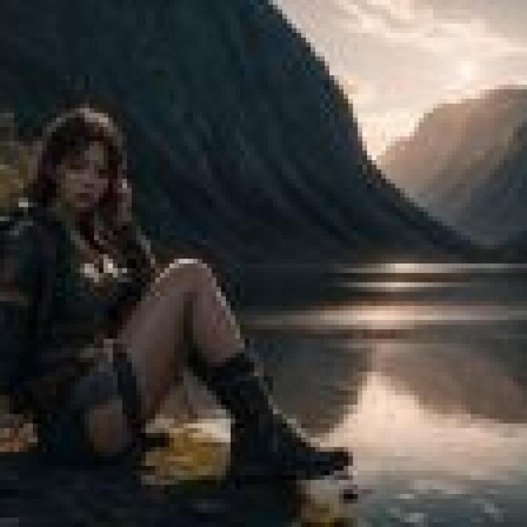 一個女人坐在湖邊的一塊岩石上,背景有山脈,在她身後的陽光,陳林,斯坦利·阿特吉爾·勞(Stanley Artgerm Lau)
