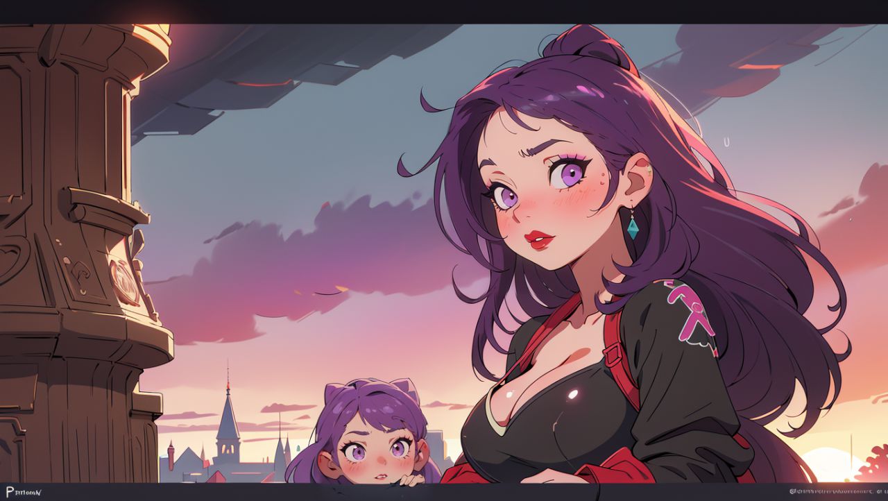 一個有紫色頭髮的女人站在一個有紫色頭髮的女孩旁邊,背景中的鐘塔,風扇Qi,在藝術站上趨勢,賽博朋克藝術,幻想藝術