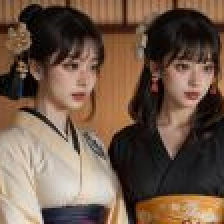 日本和服風格,兩名穿著日本傳統禮服的女人在一個房間里合影留念,帶有木鑲板和牆壁,Ai-Mitsu,Sakimichan,專輯封面,美學主義