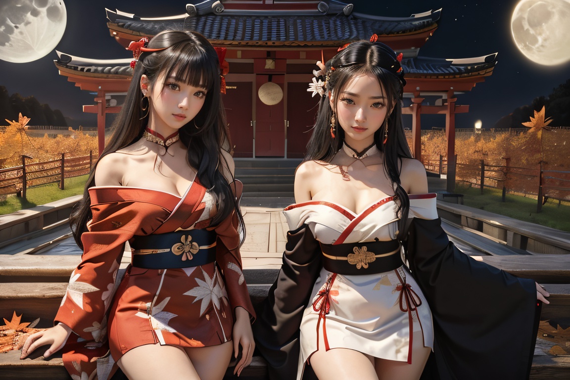 日本和服,兩名穿著服裝的亞洲婦女坐在夜晚的台階上,背景上有滿月,Artgerm,Rossdraws全球照明,計算機圖形,幻想藝術