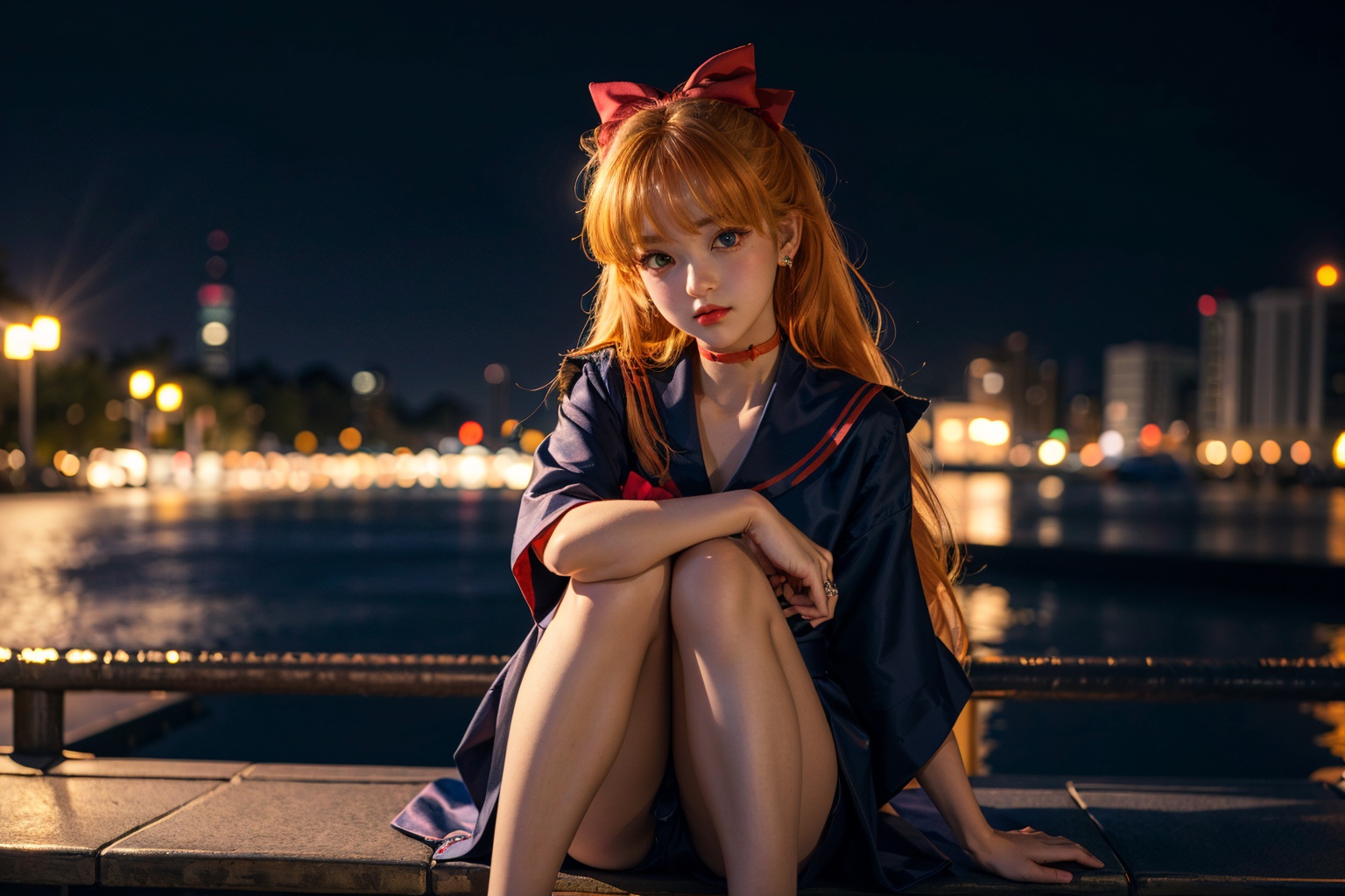 真人版,美少女戰士,水手金星,愛野美奈子,唯美桌布,動漫桌布,一個女人在晚上坐在水面前的長凳上,雙腿交叉,膝蓋躺在膝蓋上
