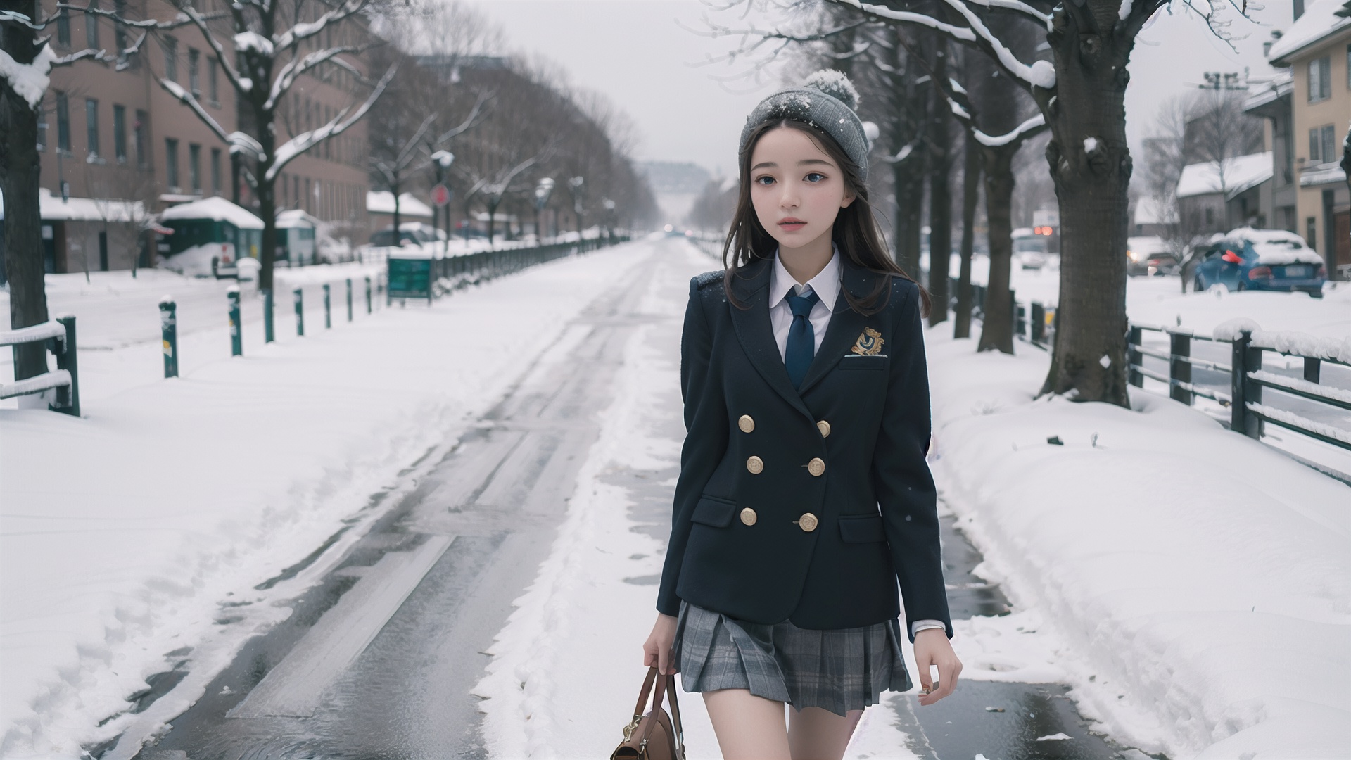 寫真美女,1女孩,袋子,裸露的樹,黑髮,黑色外套,藍眼睛,橋樑,建築物,鈕扣,城堡,城市,城市景觀,白天,夾克,長發,看著觀眾,山,領帶,領帶,戶外,百褶裙,現實世界位置,道路,廢墟,風景,書包,校服,裙子,摩天大樓,雪,獨奏,街道,城鎮,樹,冬天