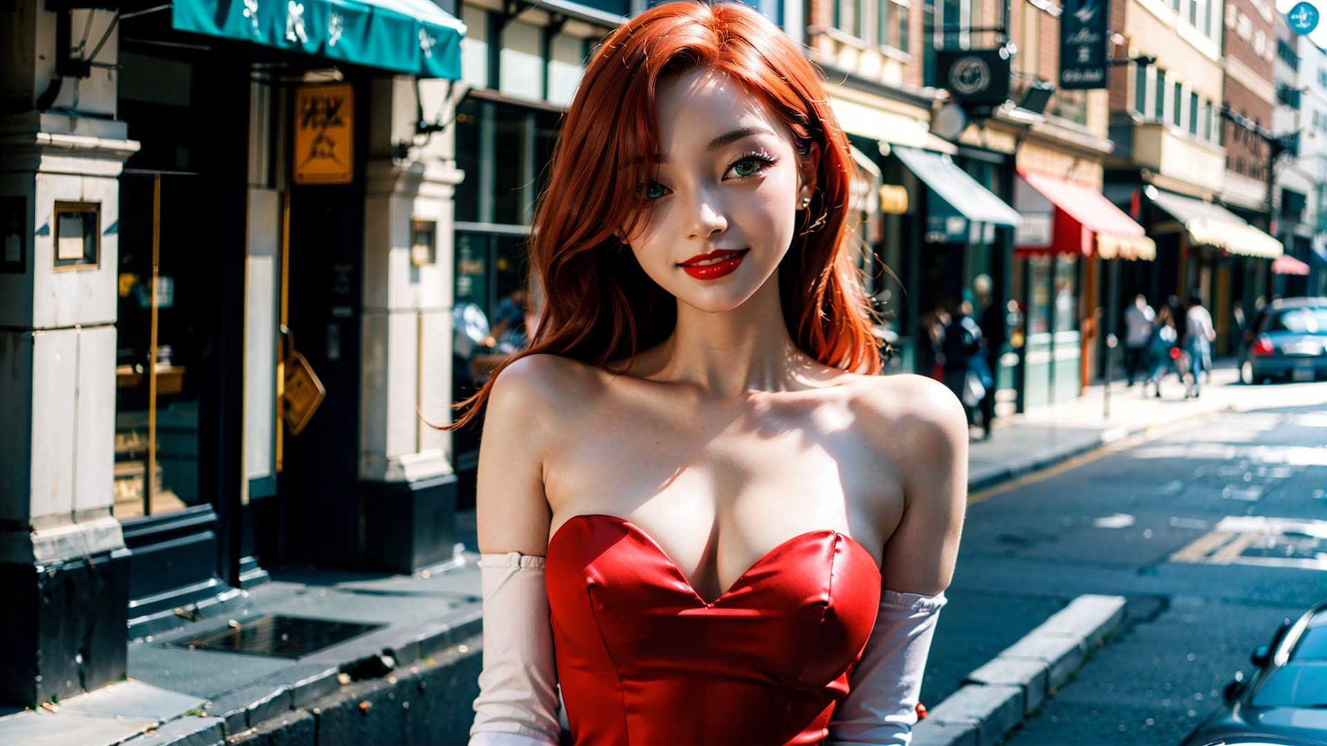 電腦桌布,真人版,兔子杰茜卡, Jessica Rabbit, 威探闖通關,Who Framed Roger Rabbit,「真實芭比娃娃」城市風,紅裙女孩現身,Artdoll真人魅影,動漫現實交匯。