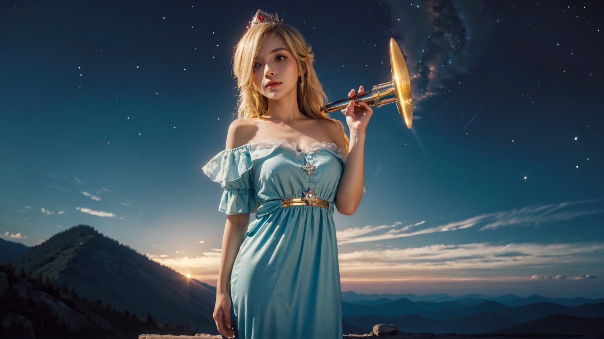 電腦桌布,羅潔塔 Rosalina, Super Mario Galaxy,真人,奇幻禮服,綾香cosplay,她手握長杖,藍衣女子手持小號,宋慧喬,手持魔杖,金發碧眼的宇宙禮服少女,美麗的精靈女孩,奇幻寫真,魔法禮服,天空 -藍色連衣裙