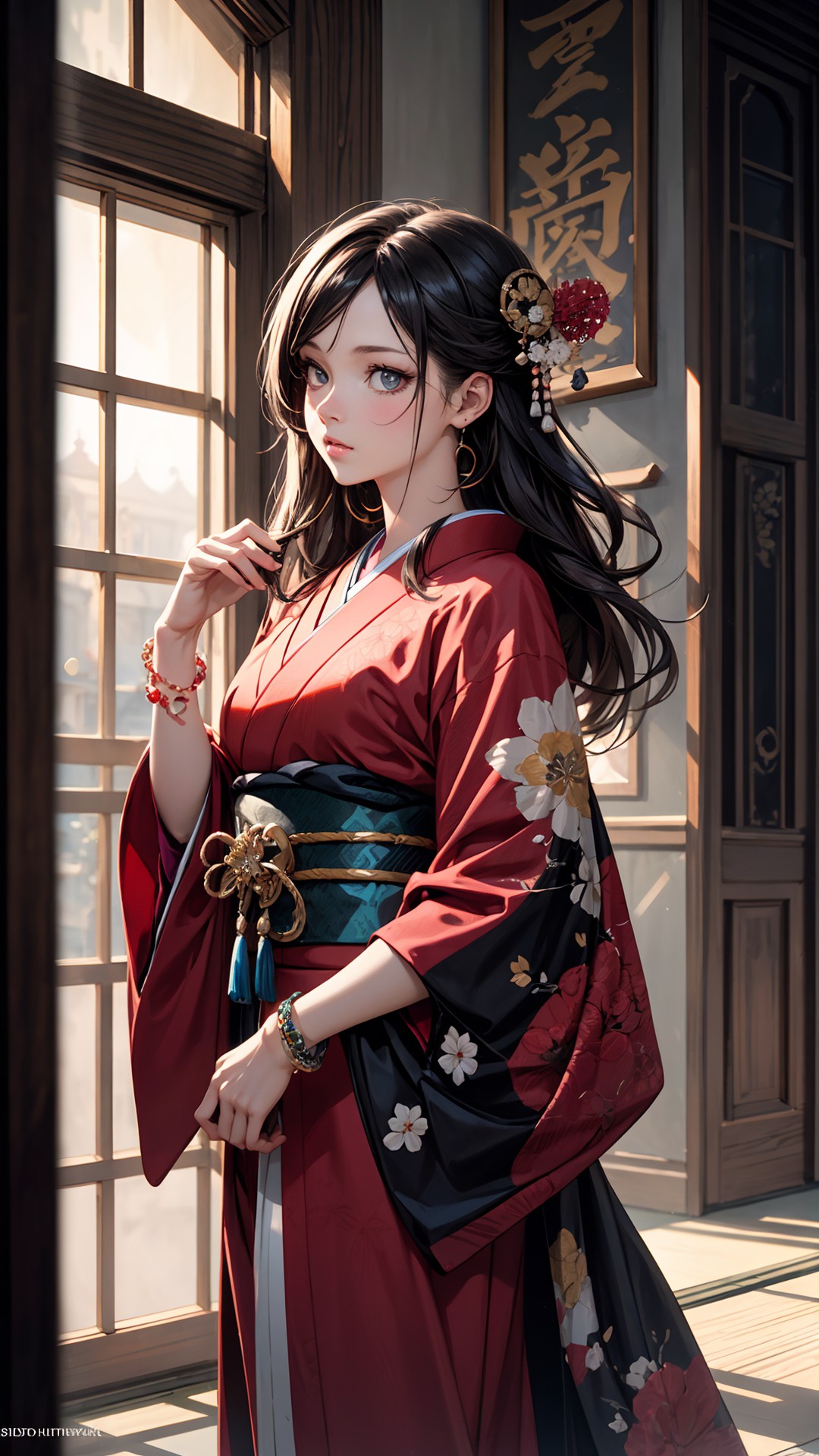 手機桌布,真人,動漫繪畫,美麗的動漫肖像,wlop 的風格,美麗的動漫風格,pixiv 的逼真動漫風格,高度詳細的和服,wlop 的藝術,一個穿著和服的女人擺姿勢拍照,wlop 繪畫風格,by WLOP,wlop | 藝術胚芽