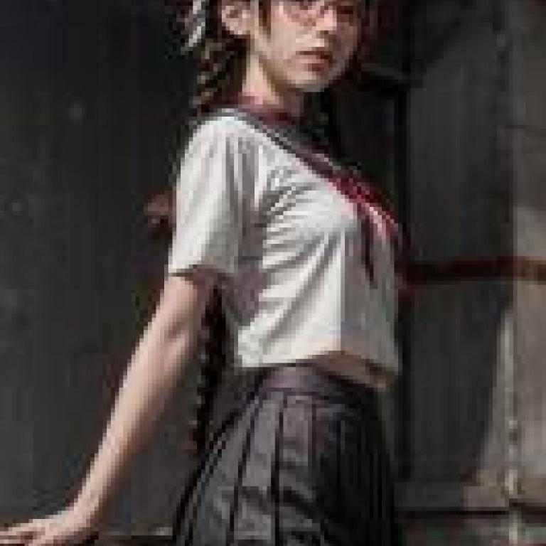 手機桌布,崎宮 ミサキ,屍體如山的死亡遊戲,寫實,照片中,一名年輕女子正處於靜靜沉思的時刻。她站在一面灰色的牆壁前,姿勢輕鬆而平靜。她的服裝十分引人注目——白色上衣飾有紅色裝飾,搭配帶有鮮豔紅色邊飾的黑色裙子。這些顏色與柔和的背景形成了美麗的對比。她的臉上架著一副眼鏡,顯得有些成熟。她手裡拿著一條紅色絲帶,絲帶的顏色與她的上衣和裙子上的色彩相呼應。這條絲帶似乎很有意義,也許是像徵性的或情感性的。她的表情很嚴肅,暗示著莊嚴或內省的時刻。儘管場景簡單,但它充滿了細節,講述了關於她和這張照片中捕捉到的瞬間的故事。