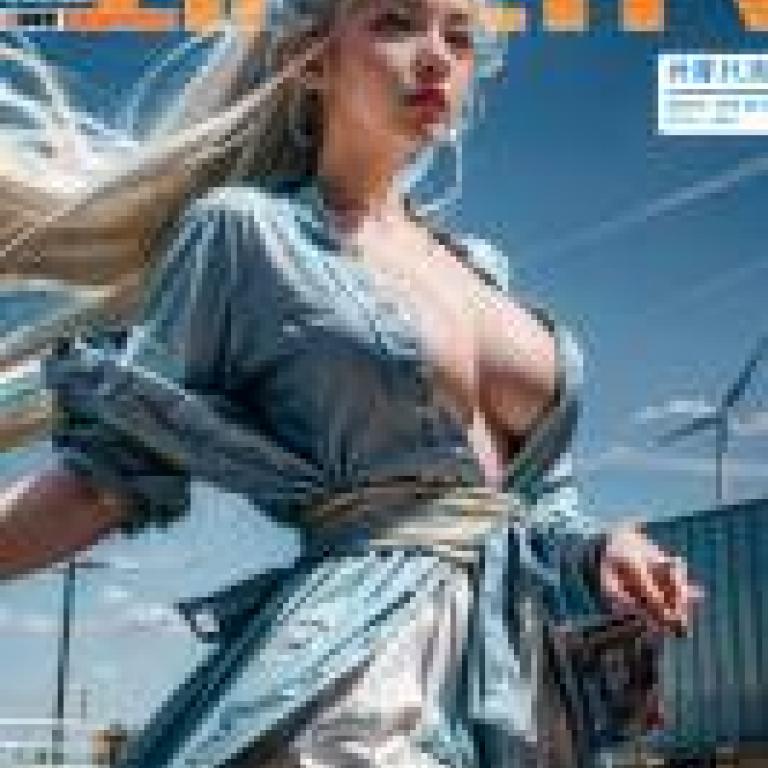 手機桌布,white dew,寫實,圖片是韓國雜誌《Vogue Korea》的封面。主角是一位有著金色長髮和藍色眼睛的女人。她穿著一件淺藍色的連身裙,領口較低,腰部繫著一條白色腰帶。她手裡拿著一個黑色的小手包。這位女士站在風力渦輪機前,風力渦輪機在天空的映襯下高高聳立。標題下方有黑白文字,提供雜誌內容的補充資訊。從圖像中無法辨別這些文字的具體內容。