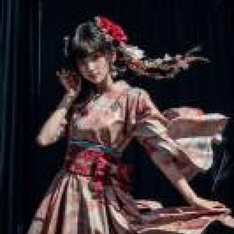 手機桌布,大西亞玖璃, Aguri Onishi,寫實,照片中,一名女子正在跳舞,她的身體隨著看不見的節奏擺動。她穿著傳統的日本和服,鮮豔的粉紅色和紅色與她盤成髮髻的黑髮形成了美麗的對比。一朵精緻的花朵(也許是櫻花)點綴著她的頭髮,為她的服裝增添了一絲自然氣息。這一幕的背景是一塊黑色的窗簾,形成了鮮明的對比,使女人和她色彩鮮豔的和服更加突出。圖片中沒有文字,焦點完全集中在舞者和她的表演上。其他物體或人的缺失進一步強調了她的孤獨,清楚地表明她是表演舞蹈的人。影像的整體構圖使觀眾彷彿置身於動作的中心,彷彿親眼目睹了這場美麗的日本傳統舞蹈表演。