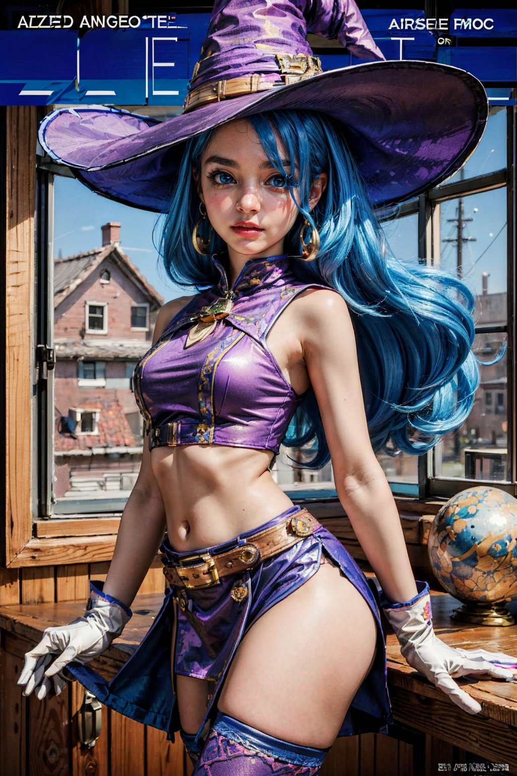 手機桌布,Selfi Rhodes - Azure Dreams,寫實,圖片的中央,一位有著鮮豔藍色頭髮的年輕女子坐在一張木桌旁。她穿著引人注目的紫色和金色服裝,與她頭上的大紫色巫婆帽相配,巫婆帽頂部飾有金色扣環。這頂帽子為她的外表增添了幾分神秘感。旁邊放著一雙白手套,也許預示著涼爽的氣候或職業。該場景暗示了一個戶外場景,可能是花園或公園,女人正在眺望自然景觀。畫面整體構圖呈現出幻想與現實的交織,魔幻與探索的元素交織在一起。