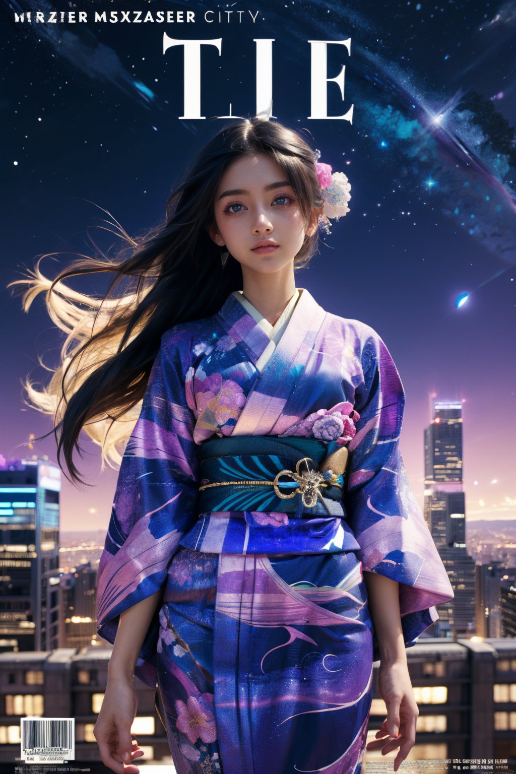 手機桌布,DonM Celestial Explorers,寫實,圖片是《Tie The Bow》雜誌的一張充滿活力的封面。前景中佔據主要位置的是一位看起來正在運動的年輕女子。她穿著一件藍色的和服,上面裝飾著漂亮的粉紅色和紫色花朵。一朵白花優雅地棲息在她的頭髮上,為她的外表增添了一絲優雅。天際線由眾多高樓大廈組成,其輪廓在夜空的映襯下格外引人注目。圖片整體色調以紫色和藍色為主,營造出一種寧靜祥和的氛圍。女人相對於城市天際線的位置表明她站在距離城市天際線有一段距離的地方,可能是在陽台或屋頂上。圖像中除了雜誌標題外不包含任何可辨識的文字。彩色前景和藍色調的背景之間的對比創造出視覺上引人注目的圖像。女人的行為、她的衣著以及場景都構成了一個可供觀者解讀的敘事。