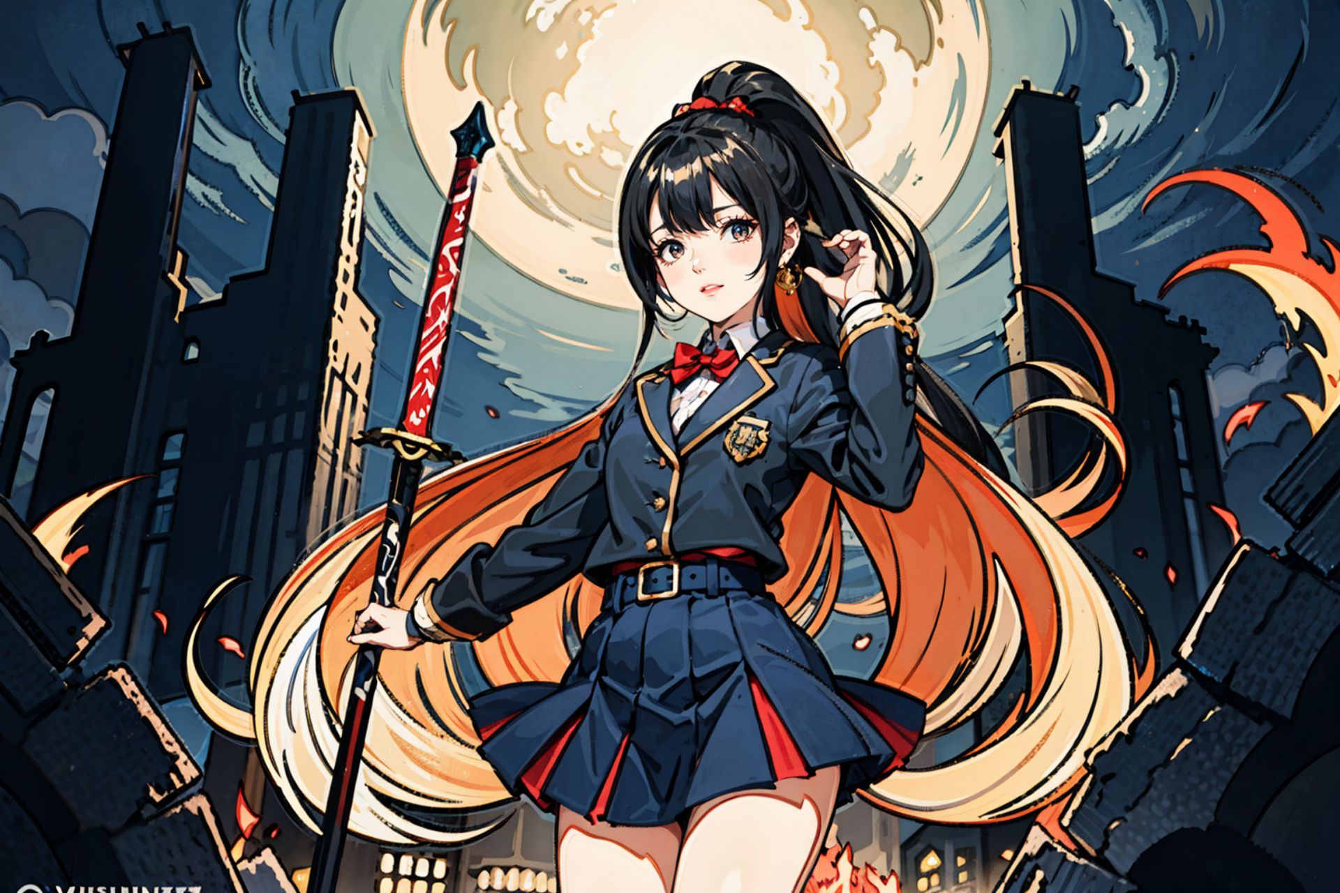 Schoolgirl Demons,畫面中央,一位年輕女子正自信地佇立。她身穿醒目的藍橙配色套裝,胸前佩戴著金色徽章。她左手自信地握著寶劍,右手隨意地搭在腰間。她整齊地束在腦後的頭髮,更增添了她泰然自若的氣質。畫面背景是城市景觀,到處都是熊熊燃燒的建築物,描繪出一幅混亂而又戲劇性的畫面。上方的天空是陰沉的灰色,與下方火紅的色彩形成鮮明對比。在一片混亂之中,這位女子堅定地屹立著,如同一盞面對混亂的燈塔。畫面中沒有文字。物體的相對位置也講述了一個故事。儘管這位女子位於前景中,但她似乎並不顯得格格不入。相反,她似乎掌控著一切,站在燃燒的城市景觀之中,卻又與之截然不同。建築物和火焰雖然細節豐富、清晰可見,但卻沒有掩蓋她的存在。相反,它們凸顯了她的力量和韌性。這幅作品是對比的研究——平靜與混亂、光與影、堅定與毀滅。然而,正是這些對比賦予了這幅作品生命力,使它不僅僅是描繪一位身穿橙色連衣裙的女子站在燃燒的建築物前;而是捕捉瞬間,定格在時間中,用無言講述一個故事。