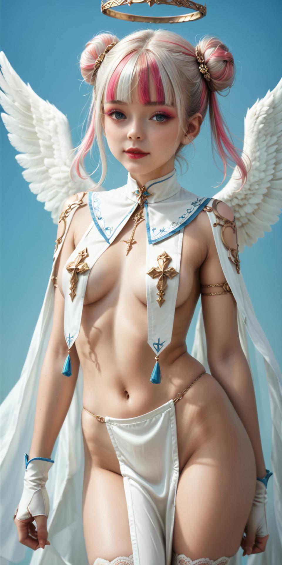 性感天使,畫面中央,一位擁有奪目粉紅秀髮的年輕女子自信地佇立於畫面中央。她身穿白色連身裙,與她鮮豔的髮色形成絕美的對比。她與洋裝相連的白色翅膀,在身後展開,為她的外表增添了一抹飄逸的氣息。她手中握著兩支藍色蠟燭,火焰緩緩搖曳。蠟燭高高舉起,柔和的光芒灑在她的臉上,更襯托出她堅定的神情。背景是湛藍的天空,點綴著朵朵白雲,為這位女子的強大氣場提供了寧靜的襯托。這幅畫捕捉到了她靜謐而強烈的瞬間,彷彿她正準備飛向身後浩瀚的天空。