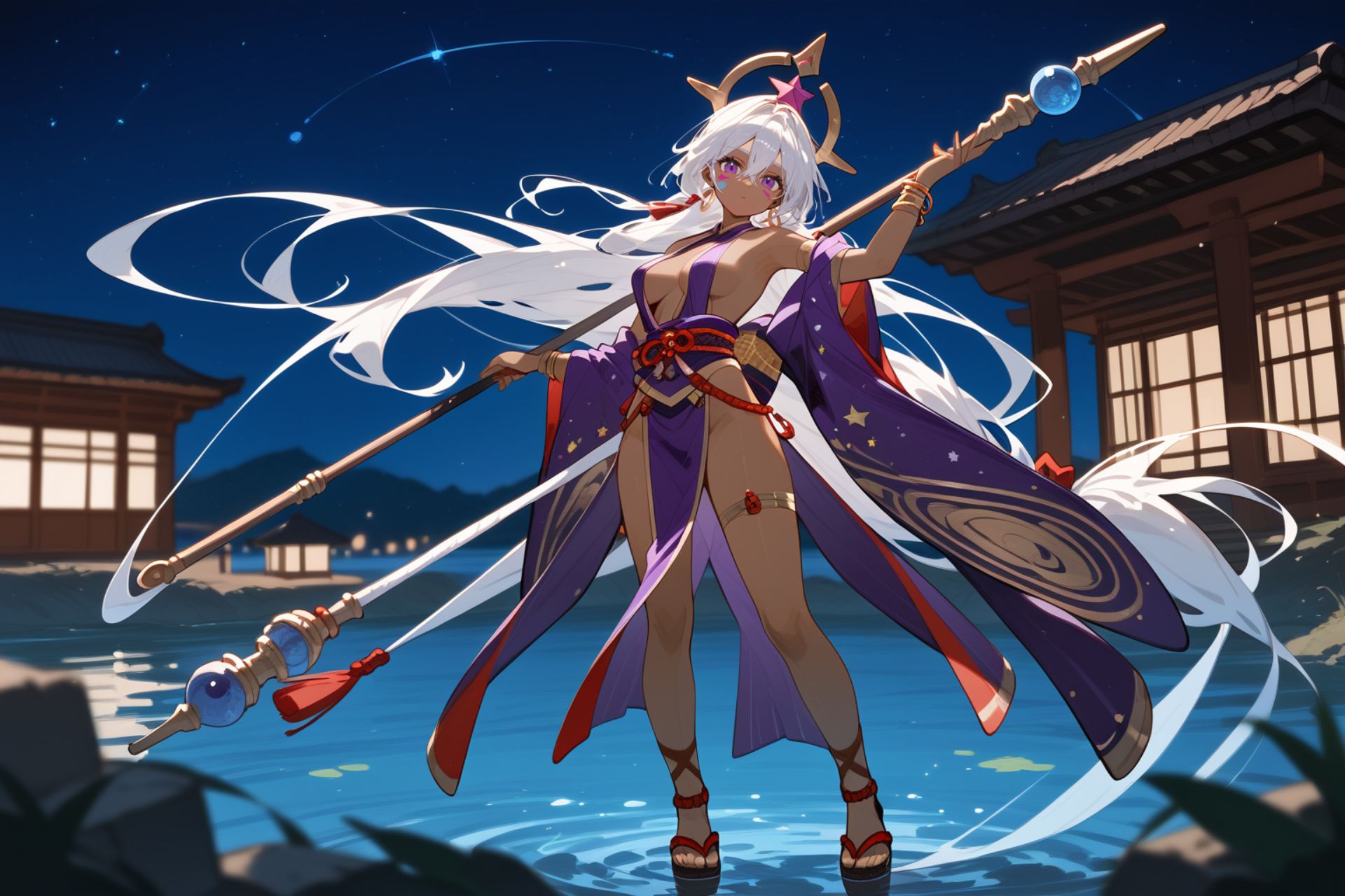 埃及風性感女神,夜空中,一位有著長長的白髮的少女。