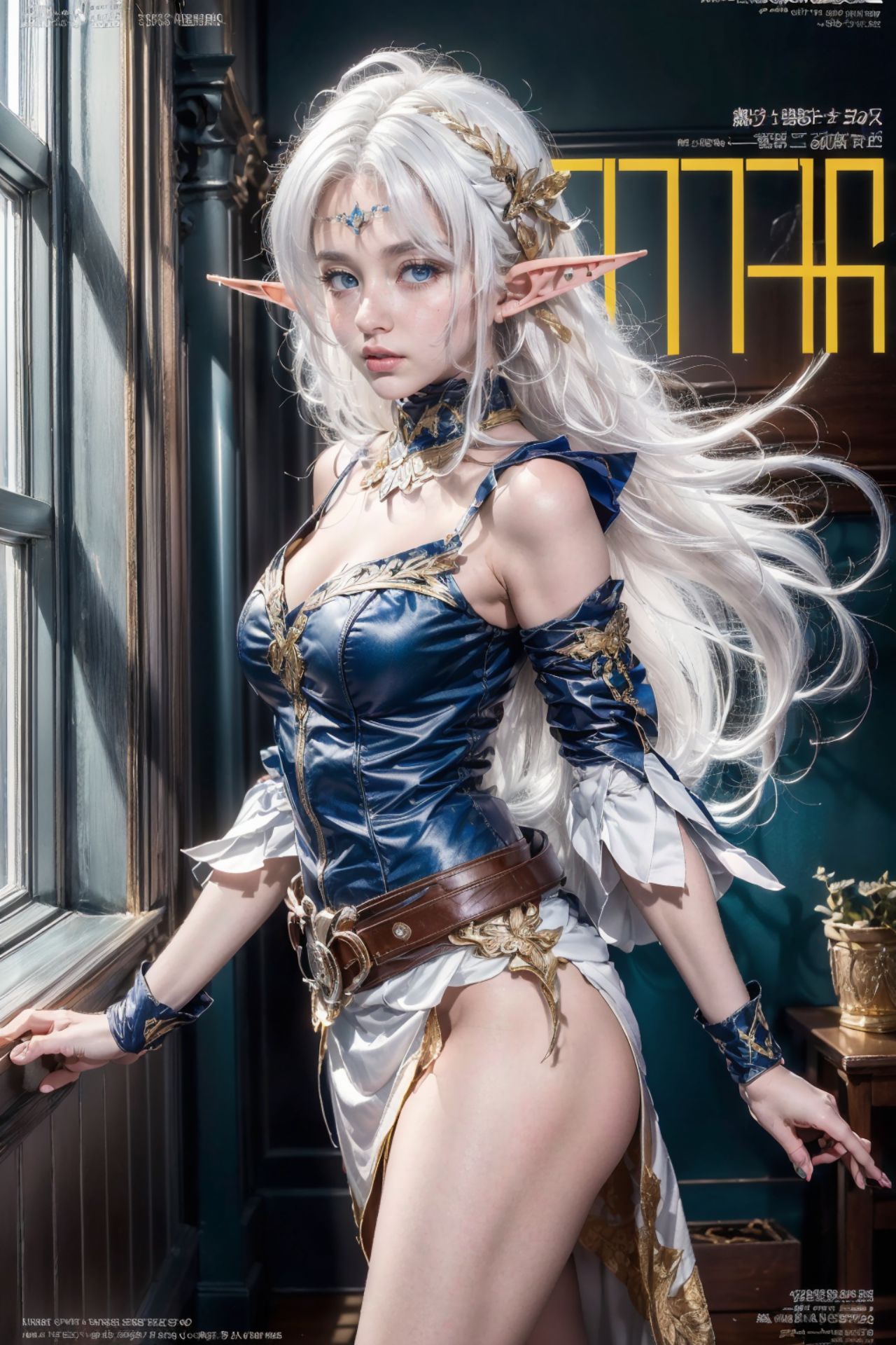 妖精,畫面中央,一位擁有白色長髮和尖耳的女子優雅地佇立著。她身穿醒目的藍色連身裙,與金色項鍊和腰帶形成絕美的對比。女子戴的一對金耳環更增添了她高貴的氣質。她站在窗前,透過窗戶可以看到窗外的世界。在她身後,一個木櫃靠牆而立。櫃子上有一個引人注目的黃色物體,僅從圖像上無法判斷其用途和來源。場景的背景是一塊深藍色的畫布,上面用白色字母醒目地印著「GLAM」字樣,為這永恆的場景增添了一絲現代感。物品的相對位置暗示著這是一個精心佈置的場景,或許是為拍攝照片或藝術展覽而設。這張影像捕捉了時間凝固的瞬間,講述了一個有待解讀的故事。