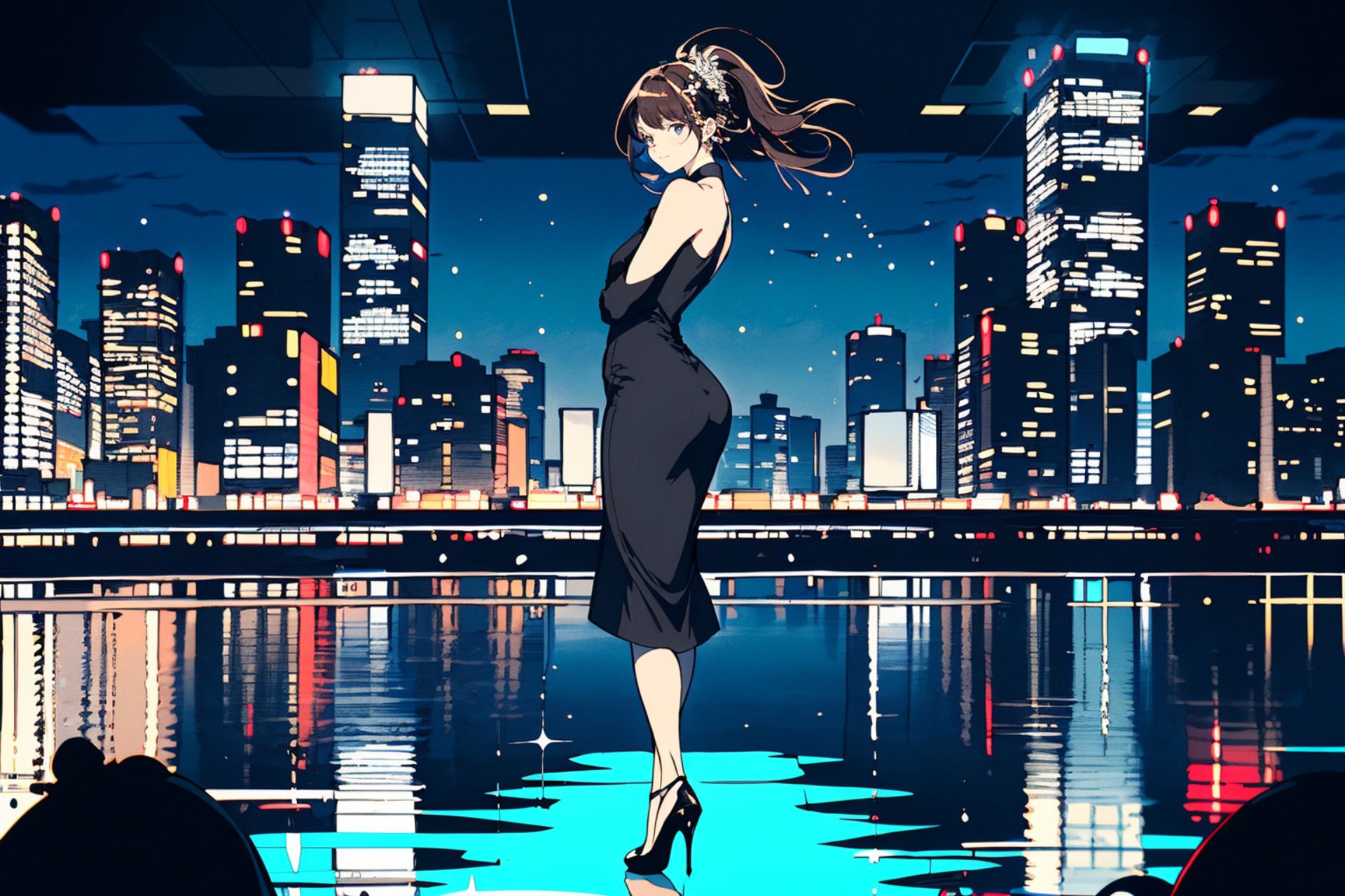 80年代漫畫女孩,照片中,一位留著棕色長髮的年輕女子站在平台上。她身穿黑色連身裙,腳上穿著高跟鞋。她的姿勢表明她正在擺姿勢拍照。她身後的城市景觀中,高樓大廈林立,五彩繽紛的燈光照亮了整個城市。這些燈光在深藍色的天空映襯下,構成了一幅充滿活力的背景。從背景中可見的水體來看,這位女士似乎身處城市環境中,可能位於海濱或河流附近。影像中沒有可辨識的文字。女士與建築物的相對位置表明,她距離觀者比城市景觀更近。影像中的顏色主要為深藍色、黑色和白色,偶爾點綴著建築物燈光的點綴。