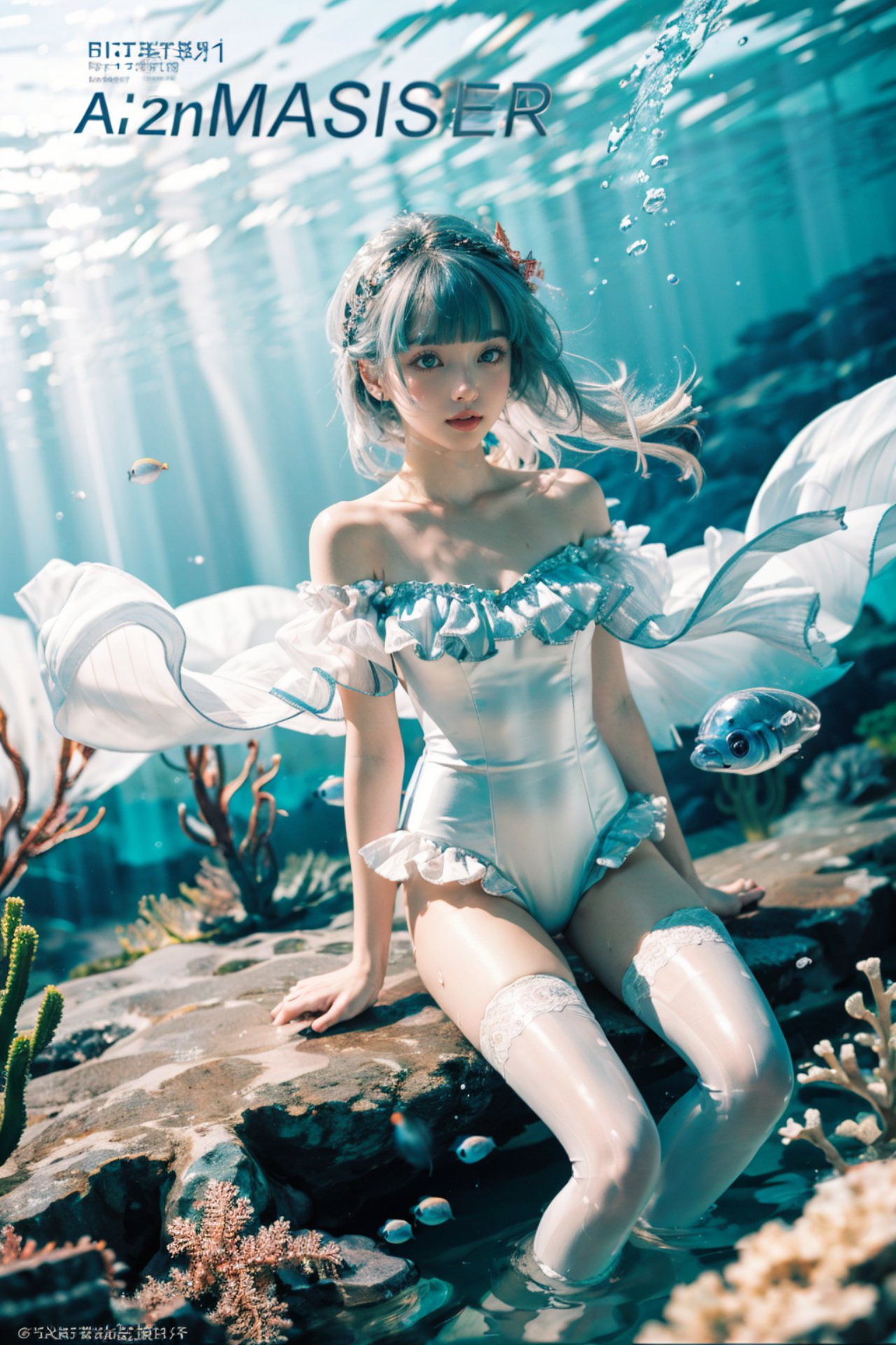美人魚,照片中央,一位少女坐在珊瑚環繞的岩石上。她穿著飾有荷葉邊的白色泳衣,手捧貝殼。她綁著馬尾辮,頭戴花冠。背景是一片藍色的海洋,點綴著氣泡和魚群。照片頂部以白色字體寫著「RIOGATI 2014 A2nMAISER」。