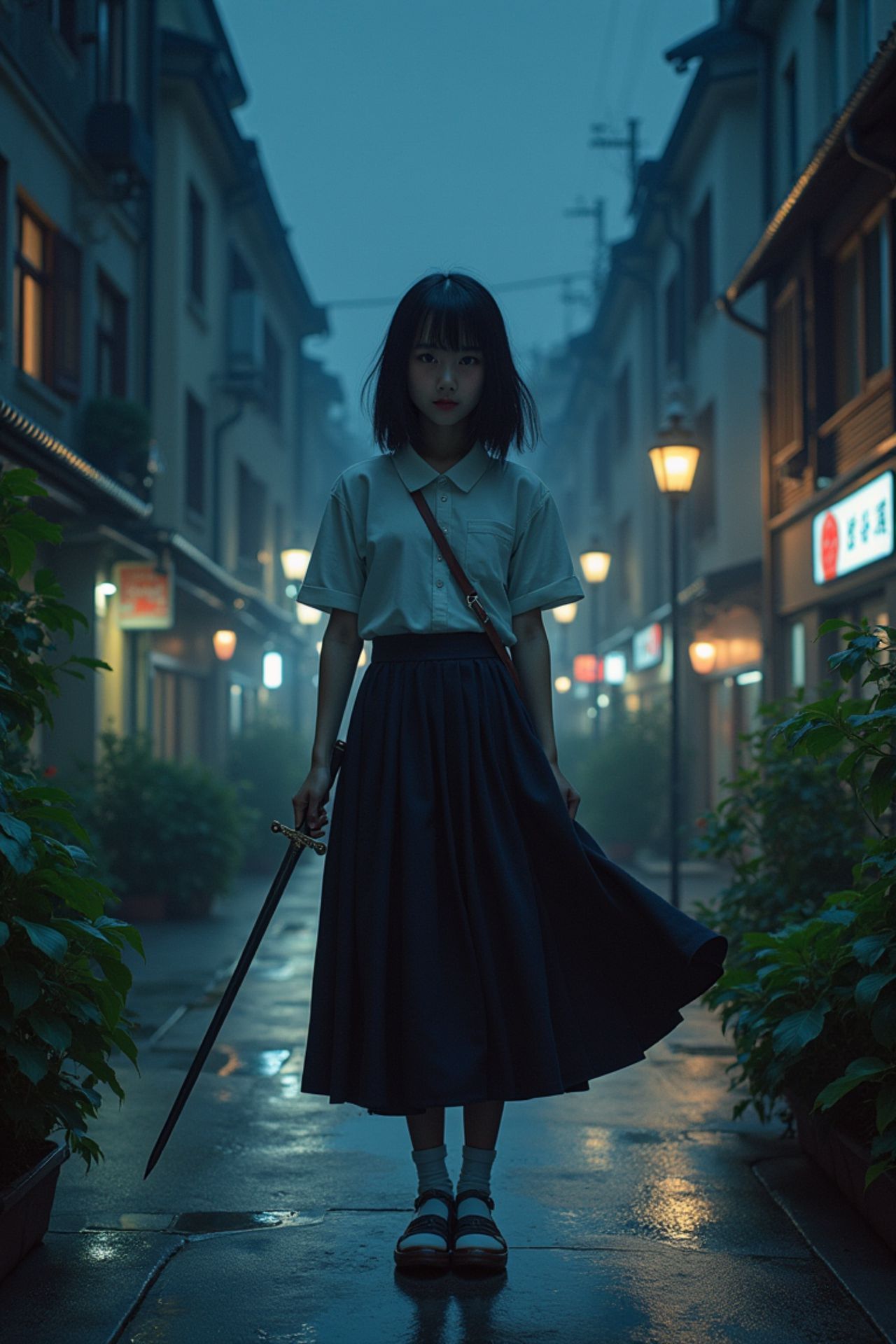 sword girl,照片中,一位年輕女子在雨夜中靜靜地沉思。她獨自站在濕漉漉的街道上,柔和的路燈照亮了她的身影。雨水使她周圍的世界閃閃發光,水滴倒映著建築物和路燈的柔和色彩。她穿著與深色裙子形成對比的白色襯衫,一手撐著黑色雨傘,另一隻手叉腰。她的目光轉向一側,彷彿陷入沉思,彷彿注視著畫框外的某個地方。她周圍的街道兩旁林立著建築物,它們的窗戶在夜空中散發著溫暖的光芒。路燈沿著街道站崗放哨,投下的光影在濕漉漉的路面上舞動。它們的光芒照亮了一家名為“PARK”的商店的招牌,醒目的字母在建築物的映襯下格外醒目。儘管下著雨,畫面中卻瀰漫著一種寧靜的氛圍,彷彿時間暫停,讓女人靜靜地凝視著周圍的景緻。這張照片捕捉了一個孤獨的時刻:一位年輕女子獨自站在雨夜,在路燈和遠處建築的柔和光線下陷入沉思。這是一個引人沉思和自省的場景,一個靜謐的世界角落被這幅畫面完美地捕捉了下來。