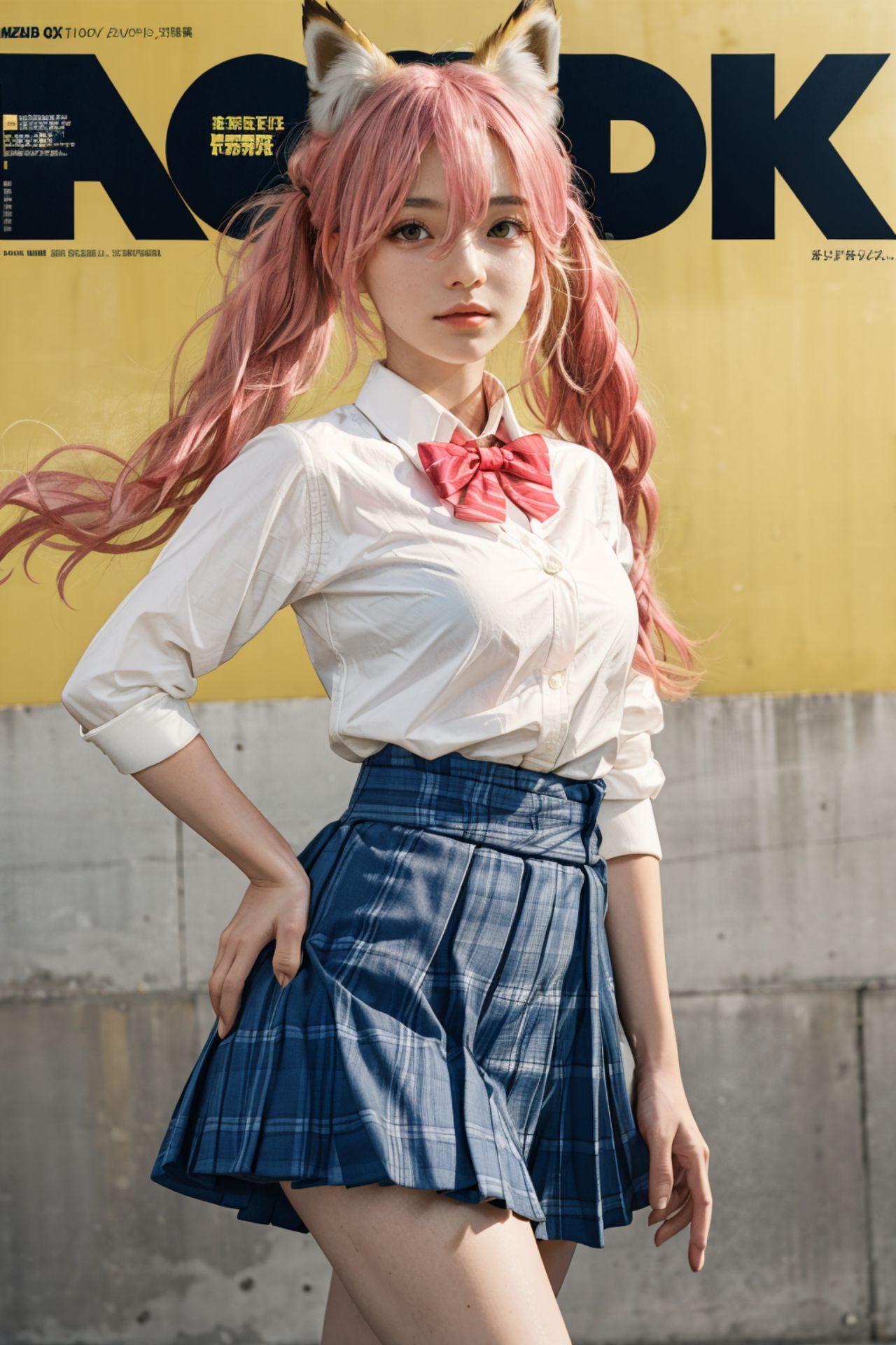 Tamamo JK Fate Extella,畫面中央,一位年輕女子身著校服,包括粉紅色領口的白襯衫、飾有格紋圖案的藍色裙子,以及搭配的藍色格紋頭帶,頭帶上飾有兩個貓耳。她的左手自信地叉在臀部,右臂則向下伸展。她背對著一面黃色的牆壁。牆上貼滿了各種服裝品牌的廣告,例如ASDK、AKIRA和GIRLS。女子站在這些廣告前,暗示她可能正在為這些品牌做模特兒或推銷產品。然而,這幅畫並沒有提供任何關於她與這些品牌關係的額外資訊。畫面捕捉了一個靜止的瞬間,除了女子泰然自若的姿態外,沒有任何動作或動作的跡象。畫面中物體的具體位置如下:女子位於畫面中央,廣告位於她身後的牆上。圖像中沒有可見的文字,無法根據其內容確定。物體的相對位置表明這是一個典型的零售場景,可能是服裝店或此類品牌的廣告拍攝。女子的服裝表明她可能是這些品牌的模特兒或代表。然而,僅憑這張照片無法確定她的具體角色。總的來說,這張照片呈現了某個時刻的快照,捕捉了一位身著校服的年輕女子在各種服裝品牌廣告背景下的身影。