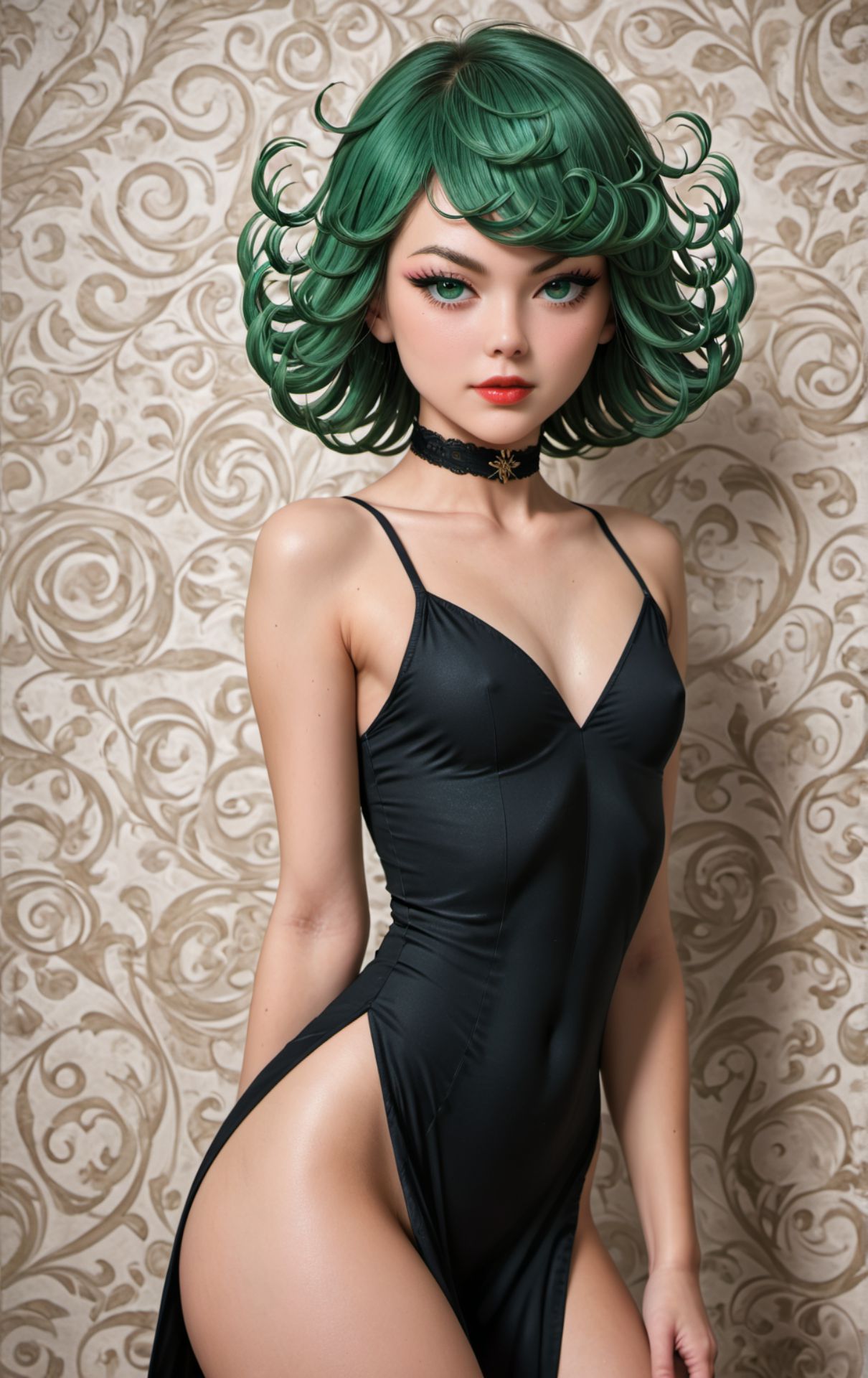 Tatsumaki,One Punch Man,照片中央,有著鮮豔綠色秀髮的少女。她身穿醒目的黑色緊身胸衣,與她的頭髮以及身後的米色牆壁形成鮮明對比。牆壁上裝飾著繁複的花卉圖案,為背景增添了層次感。女孩挺直身姿,自信泰然。她雙手叉腰,展現出典型的反抗或自信姿態。她直視鏡頭,目光堅定而堅定。畫面中沒有任何文字,焦點完全集中在花卉背景的女孩身上。畫面中沒有任何其他物體,進一步凸顯了女孩作為畫面的主體。