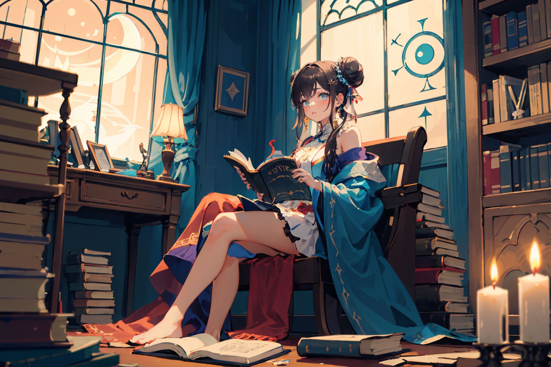 圖書館女孩,畫中,一位小女孩正全神貫注地閱讀著書籍。她舒適地坐在一張紅色坐墊的木椅上,木椅旁擺放著書桌和書架。女孩身穿藍色長袍,手捧一本黑色書籍,頭上別著一個紫色蝴蝶結,更添一抹優雅。書桌上點燃的兩支蠟燭溫暖地照耀著她所在的房間,柔和的光線更增添了溫馨的氛圍。椅子背後的牆上掛著一隻鐘,時間靜靜地流逝,女孩沉浸在自己的閱讀世界。每個物體的精準位置和相對位置,共同營造出寧靜祥和的氛圍。畫面中沒有文字,焦點完全集中在女孩和她的活動。這幅畫描繪了寧靜的學習和放鬆時刻,美不勝收。