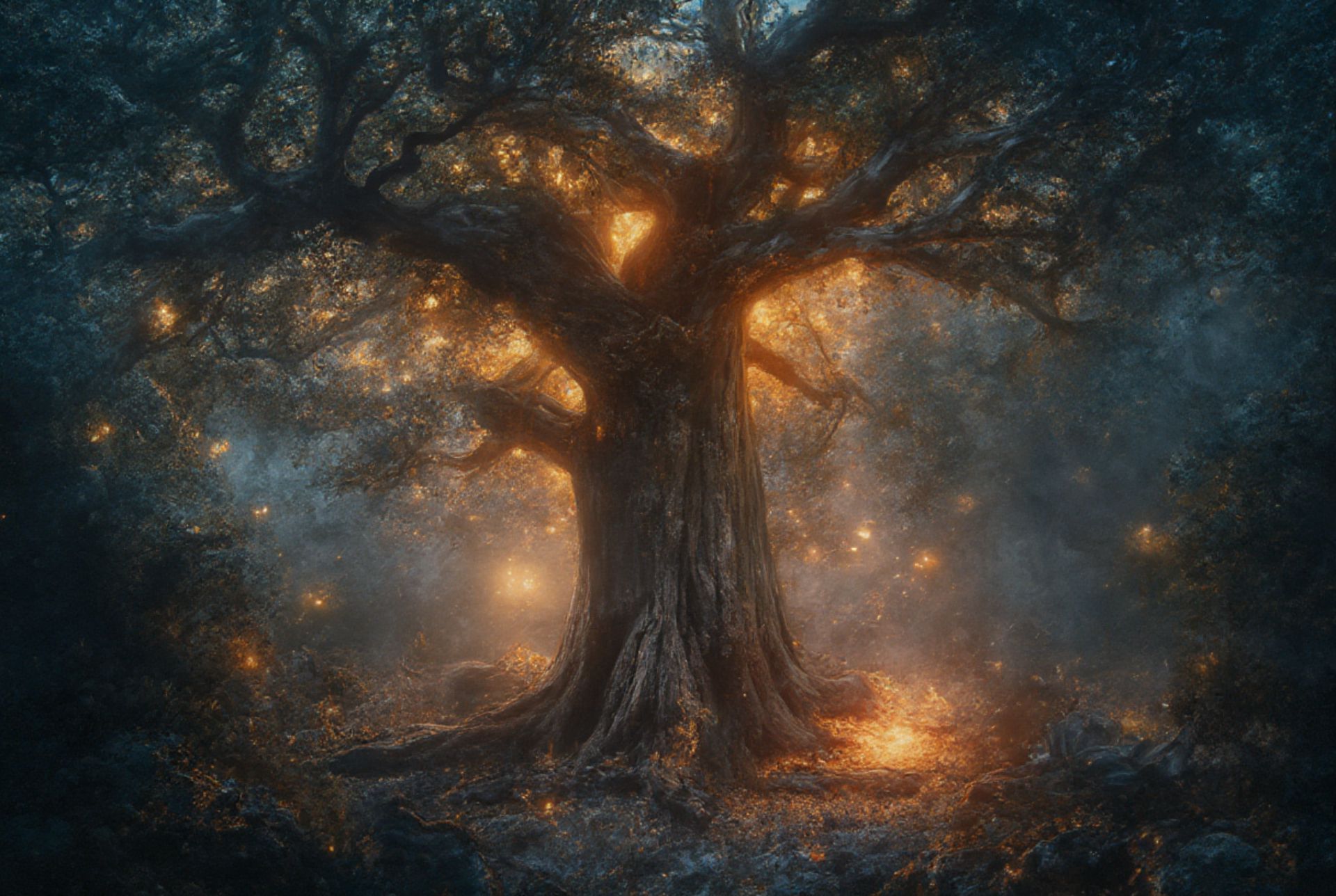迷霧森林,畫面呈現的場景以一棵枝繁葉茂、雄偉挺拔的大樹的輪廓為主,它矗立在畫面右側。樹木的深色輪廓與森林背景形成鮮明對比,森林沐浴在橙色和藍色交織的空靈光芒中。這束光芒彷彿從樹木內部散發而出,投射出長長的陰影,為場景增添了層次感。這張影像是從低角度拍攝的,仰視著這棵樹,賦予它一種雄偉的氣勢。這種視角強調了樹木的高度和廣闊的樹冠。儘管森林昏暗,樹枝上的細節錯綜複雜,但影像中卻沒有清晰的文字或可數的物體。樹木相對於場景中其他元素的相對位置位於畫面中央,樹枝延伸至畫面的左上角。影像的整體構圖展現了森林中寧靜祥和的夜晚,時間彷彿靜止不動。沒有任何可辨識的動作或運動,進一步增強了這種寧靜感。圖像不包含任何虛構的內容;它純粹是基於框架內的可見元素來描述。