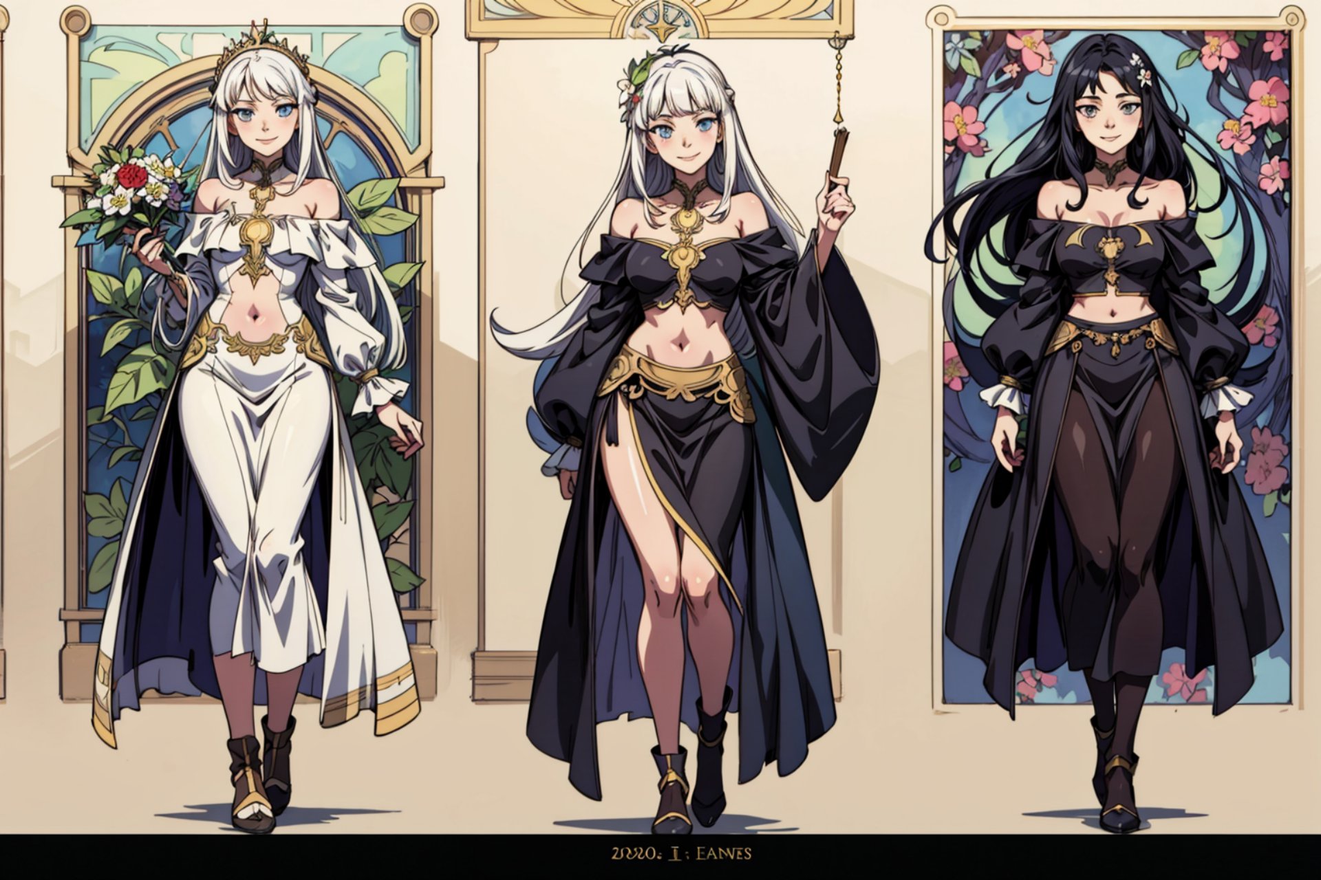 魔法女孩,這幅畫作呈現了三位女性的數位插畫,她們各自獨特的服裝和道具展現出獨特的氣質。她們站在拼貼畫的背景前,為場景增添了一抹藝術氣息。最左側,一位身穿金色點綴的白色洋裝的女子優雅大方,手中握著一朵象徵愛與美的紅玫瑰。畫面中央,另一位身穿金色點綴的黑色連身裙的女子格外引人注目,與左側的同伴相得益彰。她也握著一朵紅玫瑰,暗示著共同的主題或事件。最右側,全身黑衣的女子,與其他人不同,她手中握著的不是玫瑰,而是一把劍,象徵力量和權力。畫面中央是一幅繪畫,描繪了兩位站在宮殿前的女性,宮殿帶有金色點綴,或許象徵著宏偉或高貴。畫面中的每個元素都構成了一個開放的敘事,可供解讀,引導觀者深入探討其像徵意義和意義。