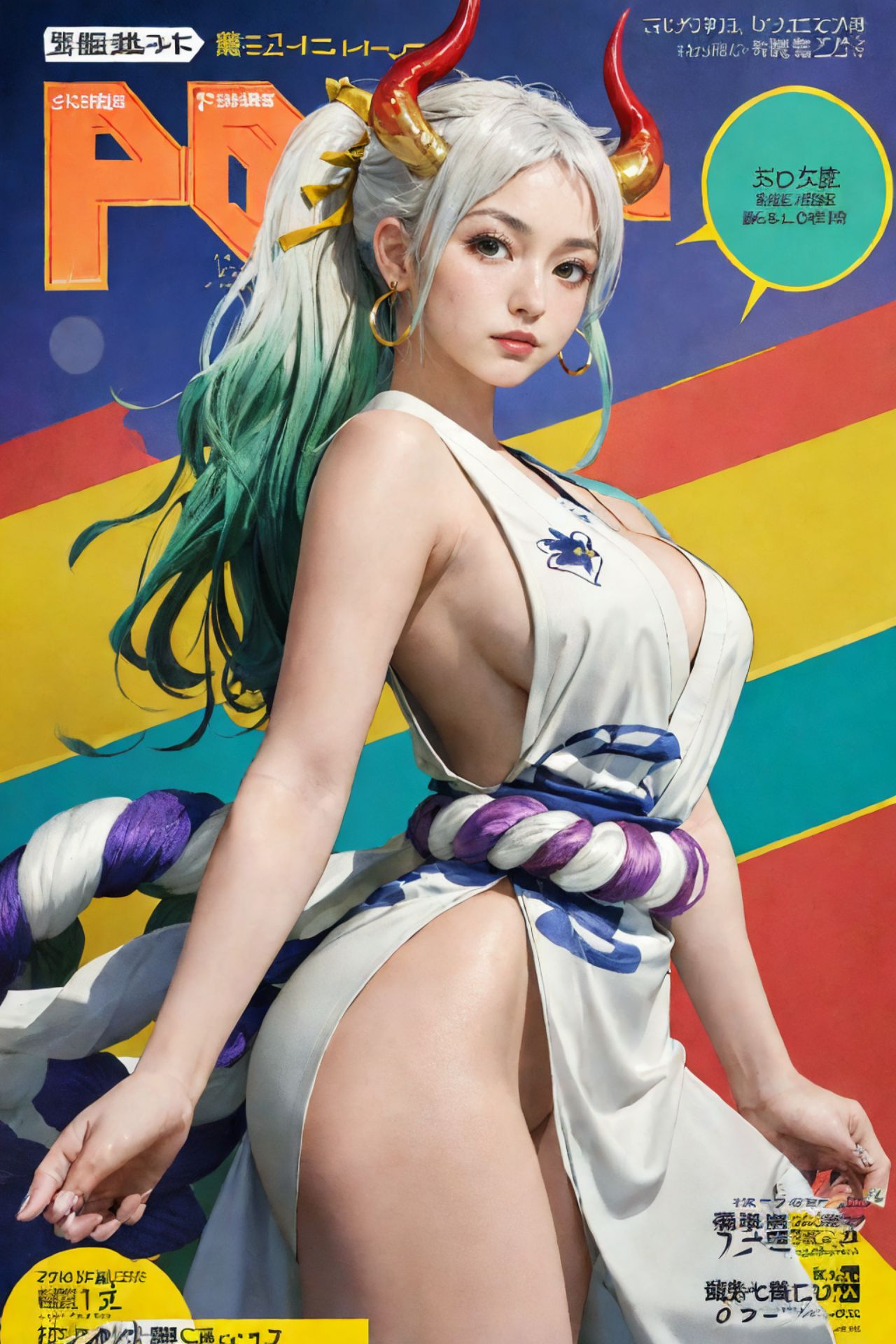 Yamato,One Piece,這張圖片是日本漫畫雜誌《P-Style》的封面。封面的主角是一位有著一頭亮藍色頭髮的年輕女子。她身穿飾有藍粉色條紋的白色背心,搭配同色系的紫色半身裙。紅色的角點綴其間,更增添了一絲神秘的魅力。背景是鮮豔的橙色和黃色,與女性形象形成鮮明對比。一條彩虹色的絲帶沿著封面的下緣延伸,為整體設計增添了一絲奇思妙想。右上角有一個綠色的對話泡泡,裡面是日文,暗示這本雜誌可能是日文版。左下角是一條粉紅色橫幅,上面寫著白色的日文,可能是雜誌的標題或其他與內容相關的資訊。這位女性站在一個黑色輪廓的白色底座上,使她成為畫面的焦點。她的目光投向畫框外的某個地方,讓人對她正在註視的東西感到好奇。封面藝術的整體構圖表明,它的設計旨在吸引潛在讀者的注意力,並吸引他們打開雜誌以了解更多內容。