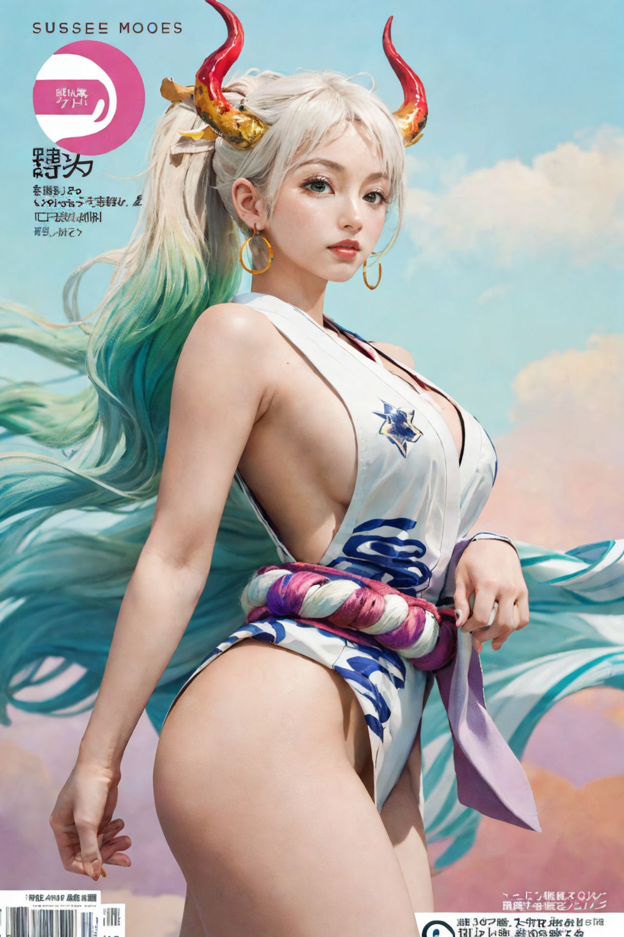 Yamato,One Piece,畫面中心人物是一位女性。她有著一頭奪目的藍色秀髮和一對紅色的犄角,為她的外表增添了一絲夢幻的色彩。她身穿白色上衣,腰間繫著一條藍粉色相間的腰帶,為她的造型增添了一抹亮色。畫面背景是淡紫色的天空,點綴著朵朵白雲,為主體營造出寧靜祥和的氛圍。女性站立的姿勢充滿動感,一條腿彎曲至膝蓋,另一條腿向後伸展,暗示著運動或舞蹈。畫面中還包含一些文字。 SUSSEE MODES 似乎與這幅畫的藝術家有關。在女性下方,有一小段文字寫著“COLOMBIA SUGAR CO.,LTD 2012”,這可能是與這幅作品相關的公司或年份。畫面中物體的相對位置使得女性位於前景,而天空和白雲位於背景。文字被放置在不同的高度——一個在女人上方,另一個在女人下方,從而形成了一種平衡的構圖。總體而言,該圖像呈現出一個充滿活力和動態的場景,以寧靜的天空為背景,圍繞著一個奇幻的人物。
