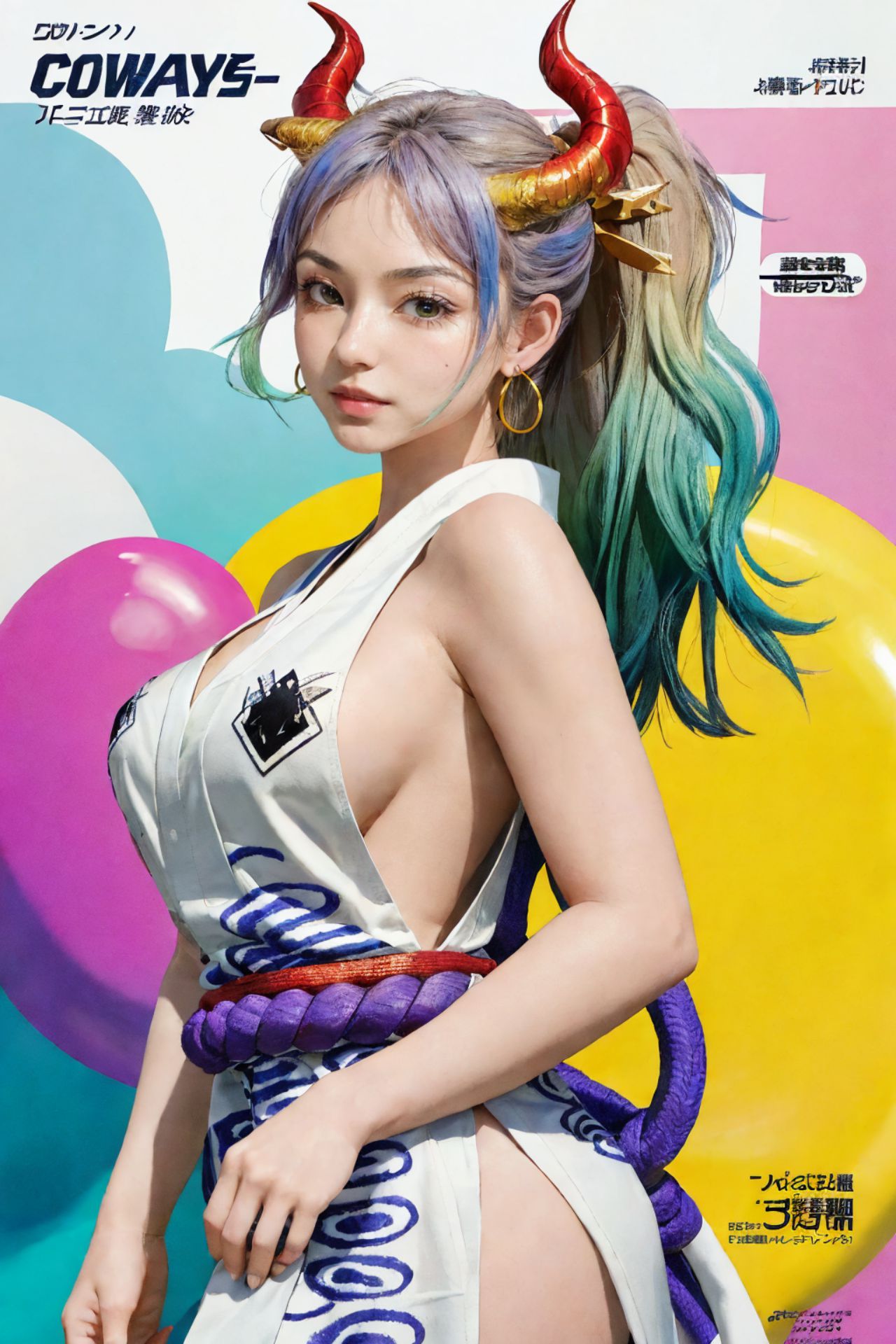 Yamato,One Piece,照片中,一位女子藍綠相間的長髮,散發著鮮豔的色彩。她額頭上裝飾著紅色的角,為她的外表增添了一抹亮色。她身穿白色連身裙,飾有藍色漩渦紋飾,腰間繫著紫色腰帶。她身後的背景由粉紅色過渡到黃色,營造出溫暖宜人的氛圍。背景並非空無一物,而是點綴著氣球、圓圈等各種物體,為畫面增添了層次感。女子的目光注視著畫面左側,表情嚴肅,彷彿陷入沉思,又彷彿在觀察畫外的事物。除了視覺元素外,圖像中還包含文字。 「COWAYS」一詞佔據顯著位置,可能暗示該圖像的品牌或主題。此外,還有一行日文“憭折”,意為“大阪”,暗示了這張圖像可能的地理背景。整體而言,這幅圖像捕捉到了時間定格的瞬間,以女人為中心人物,背景色彩繽紛、引人入勝。