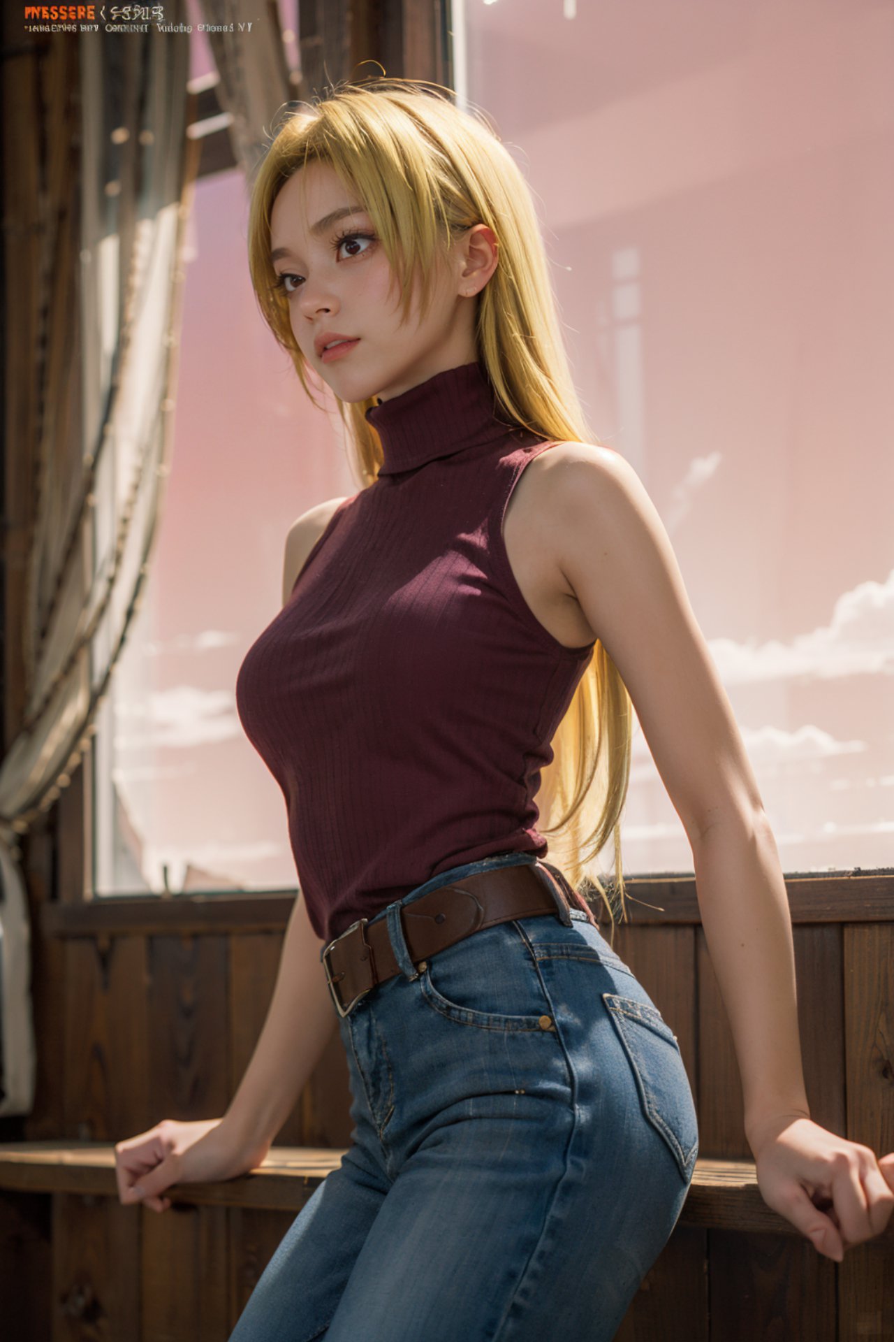 Yuki Tsukumo Jujutsu Kaisen,畫面中央,金髮披散肩的年輕女子。她穿著鮮豔的紅色無袖上衣和經典的藍色牛仔褲,為畫面增添了一抹亮色。棕色腰帶束於腰間,更襯托出她的曼妙身姿。她自信地站在窗前,窗外是一抹寧靜的雲朵,背景是晴朗的天空。女子似乎陷入沉思,目光投向畫面右側的某個不可見之物。她的姿勢和表情暗示著她正在自省,或許是對尚未展開之事的期待。畫面中沒有任何文字或可辨識的物體動作。女子的相對位置暗示她身處室內,窗戶是通往遠處廣闊天空的入口。遠處的雲朵為場景增添了深度和浩瀚之感。此描述基於圖像中可見的元素,不包含任何推測或想像的內容。它提供了圖像內容的詳細說明,重點關注物件類型、顏色、數量、動作、精確位置和適用的文字。