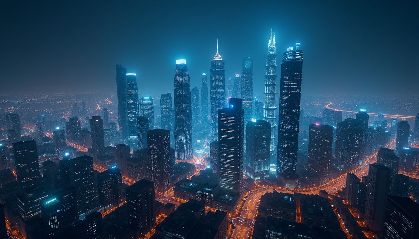 城市夜景,這張照片捕捉了令人嘆為觀止的城市夜景。畫面中聳立著高樓大廈,它們外牆上閃爍著明亮的藍色燈光,與漆黑的夜空形成鮮明對比。這些建築密集排列,營造出峽谷般的效果,為畫面增添了深度。縱橫交錯的道路上車水馬龍,即使從如此高處的視角也能清楚地看到車燈。整座城市熙熙攘攘,熱鬧非凡,充分展現了其充滿活力的夜生活。前景中,一座橋樑橫跨畫面,連結城市的兩部分,為城市景觀增添了另一層複雜性。儘管夜色已深,這座城市依然生機勃勃,燈火輝煌,熙熙攘攘,在浩瀚無垠的星空下,構成了一幅絢麗多彩的景象。