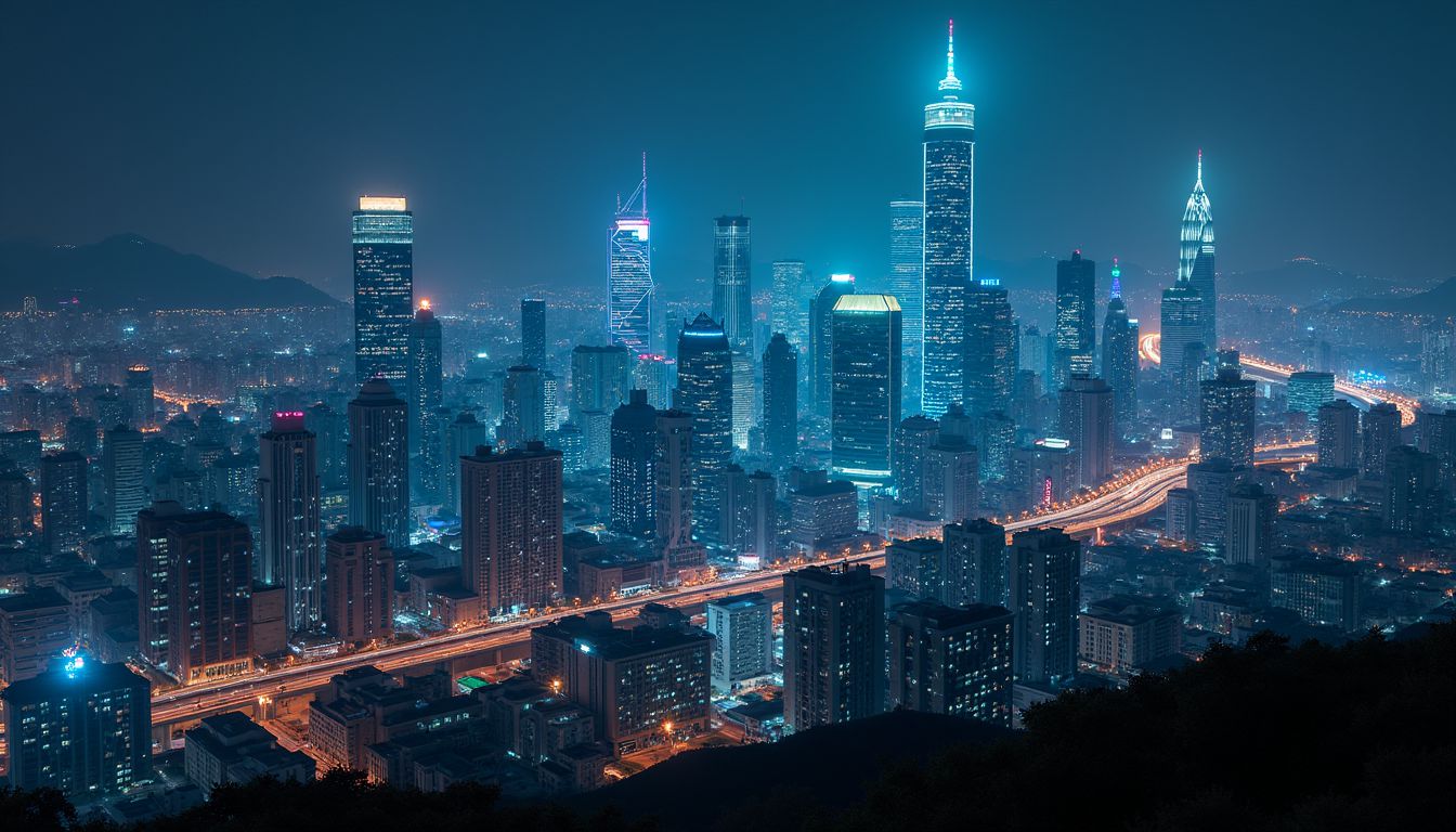 城市夜景,這張照片捕捉了令人嘆為觀止的城市夜景。拍攝角度很高,可能是從山頂或高樓之巔,可以俯瞰下方的城市全景。五彩繽紛的燈光照亮了整座城市,在漆黑的夜空中交相輝映,構成了一幅絢麗的景象。最引人注目的是白色的摩天大樓,它們的頂部裝飾著藍色的燈光,如燈塔般刺穿夜空。遠處群山環繞,山巒的輪廓為畫面增添了層次感。畫面中沒有明顯的文字或可計數的物體。建築物的相對位置表明這是一個人口稠密的城市,而摩天大樓很可能位於市中心或中央商務區。