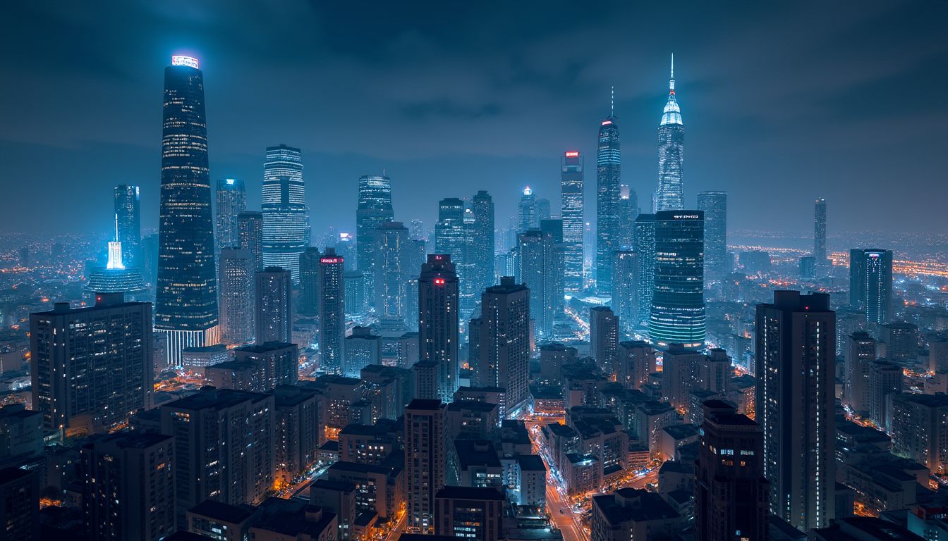 城市夜景,這張照片捕捉了夜幕下充滿活力的城市景觀。高樓林立,窗戶上溫暖的燈光映襯著深邃的夜空。照片採用高視角,俯瞰整座城市。城市坐落於山丘之上,為畫面增添了縱深感。背景中的天際線因其高度和與觀者的距離而格外醒目。儘管夜色已深,城市依然燈火通明,燈火輝煌的建築與漆黑的夜空形成鮮明對比。畫面中沒有任何文字或具體的動作。物體之間的相對位置暗示著這是一個熙熙攘攘的都會環境,建築物鱗次櫛比。畫面中沒有出現任何行人或車輛,暗示著夜已深。