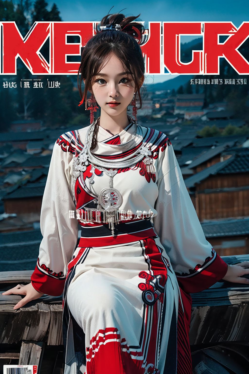 苗族服飾 白色苗疆服飾,一位身穿紅白洋裝的女孩盤腿而坐。
