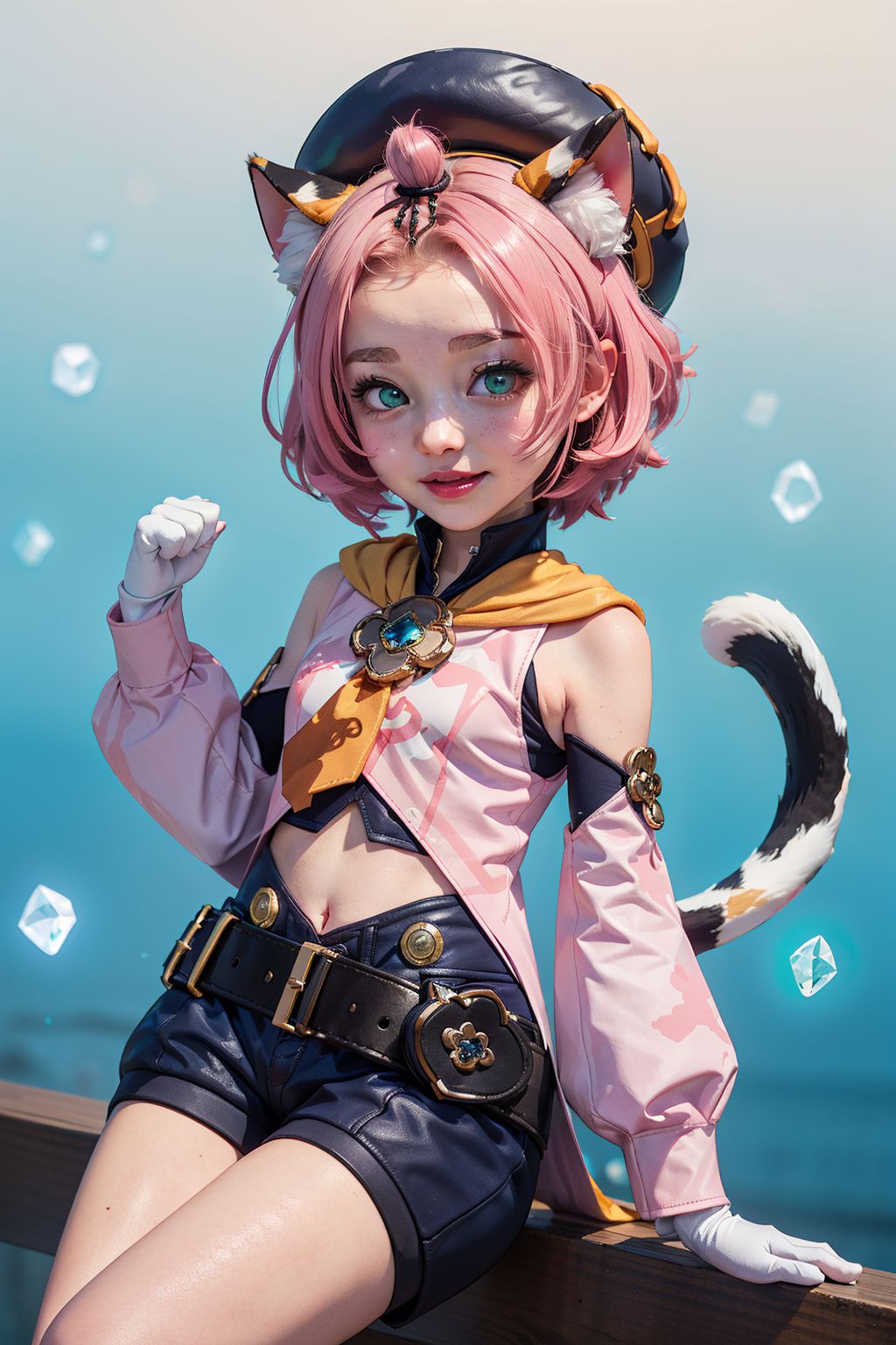 在迪奧娜·凱茨萊因(Diona K tzlein)的作品《迪奧娜·凱茨萊因》中,一位年輕女孩以俏皮的姿態出現在畫面中央。她坐在木凳上,雙腿交疊,雙臂舒適地搭在扶手上。她身穿鮮豔奪目的粉紅色連身裙,與黑白條紋的貓耳朵形成鮮明對比。一條金色腰帶束緊腰身,為整體造型增添了一絲優雅。她的目光看向一旁,似乎在關注畫面之外的事物。背景是寧靜的藍天,點綴著朵朵白雲和散落的藍色鑽石,營造出一種空靈縹緲的氛圍。儘管畫面簡潔,卻洋溢著歡樂和奇思妙想。畫面中沒有任何文字或其他物體。女孩、她所坐的長凳以及背景元素——天空、白雲和鑽石——構成了這幅作品的主要組成部分。女孩的相對位置在畫面中心,長椅在她下方,背景從四面八方環繞著她。