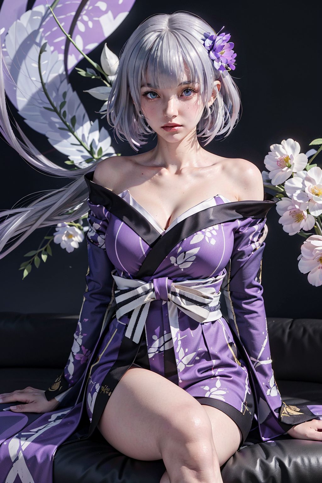 陰陽師伊津奈·天馬覺醒。畫面中心是一位留著灰色長髮和瀏海的年輕女子。她頭上戴著一朵紫色的花朵,為她的外表增添了一抹亮色。她穿著一套醒目的紫黑相間服裝,上身是束腰胸衣,中間繫著蝴蝶結,腰間用腰帶束緊。裙擺如瀑布般傾瀉而下,與上身的配色相呼應。她坐在黑色的沙發上,與她鮮豔的服裝形成鮮明的對比。在她身後,一面白色的牆壁作為背景,牆上裝飾著紫色的花束,與她頭上的花朵和束腰胸衣上的蝴蝶結相呼應。整幅畫的構圖以女子為中心,周圍環繞著各種色彩和圖案元素,突顯了她的存在感。