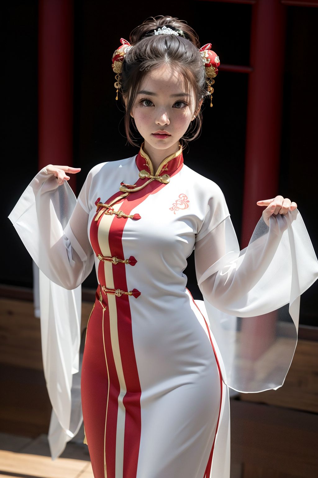 這張照片捕捉了一位身著傳統中國服飾的年輕女子的瞬間。她佇立於靜謐的花園背景前,雙手優雅地擺出一個充滿文化底蘊的姿勢。她身著一襲白色長裙,裙邊飾以精緻的紅金滾邊,色彩鮮豔奪目,象徵中國文化中的繁榮與喜悅。與長裙相得益彰的是一副精美的耳環,其精巧的設計展現了傳統珠寶的藝術魅力。她的站姿宛如一支書法筆,這是中國藝術中常見的意象,象徵創造力和藝術表達。她的目光直視鏡頭,與觀者之間建立起一種親密的連結。背景也展現了更多景緻——樹木暗示著寧靜的花園,而一扇紅色的大門則為畫面增添了一抹亮色。整幅照片描繪了一幅傳統與現代交融的畫面,展現了文化在日常生活中鮮活流露的魅力。