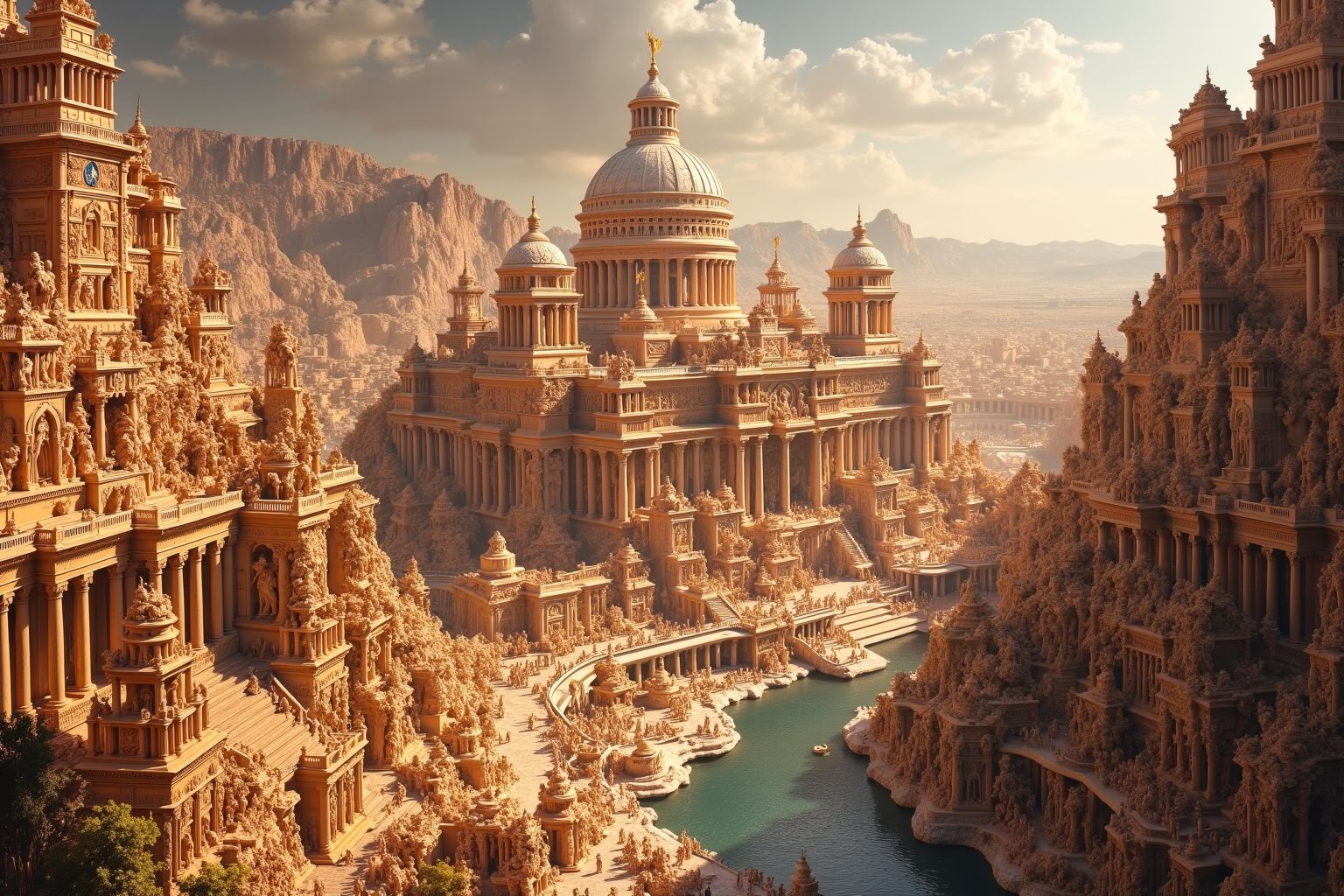 亞特蘭提斯幻象。這張照片展現了位於土耳其阿克薩賴的著名地標——蘇丹哈尼商隊旅館的壯麗景色。這座建築奇蹟完全由石頭建造,其精巧的細節和設計元素令人嘆為觀止。多個圓頂和塔樓更增添了它的宏偉氣勢。照片從高處拍攝,捕捉了整個建築,並提供了周圍地區的全景。商隊旅館坐落在壯麗的山巒之中,人造建築與周圍自然美景形成鮮明對比。湛藍的天空點綴著朵朵白雲,更添一份寧靜祥和的氛圍。一條河流蜿蜒流淌在背景中,巧妙地提升了照片的整體構圖。儘管描述詳盡,但照片中沒有任何可辨識的文字或物體正在進行的特定動作。畫面中各物體的相對位置不變,商隊驛站位於中心,兩側群山環繞,遠處河流蜿蜒流過。畫面色彩以自然色調為主,石砌建築的米色與天空的藍色和周圍景觀的綠色和諧交融。此描述基於圖像的可見內容,不包含任何推測或虛構的細節。其目的是在盡可能減少美感解讀的同時,客觀地呈現圖像內容。