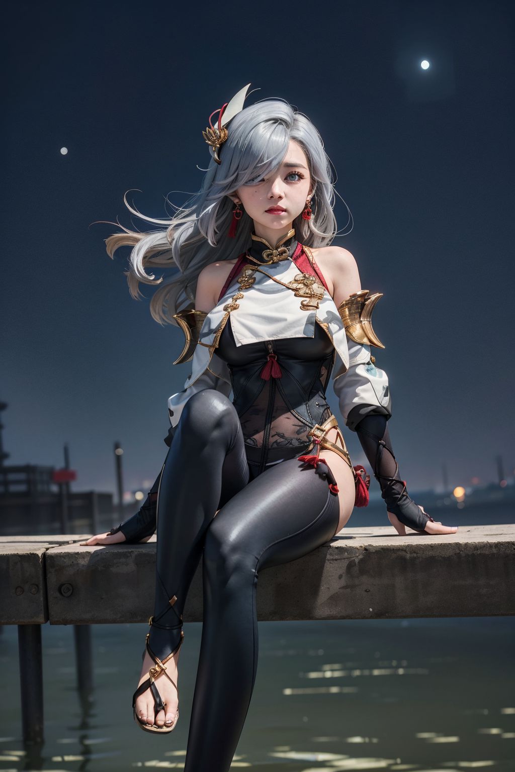 照片由切爾西·科沃卡拍攝,畫面中一位銀髮女子倚靠在木質欄桿上。她穿著黑金相間的服飾,包括緊身胸衣和過膝長靴。她雙臂交叉抱在胸前,姿態放鬆。背景是一片寧靜的水域,深藍色的天空下波光粼粼。一輪滿月從地平線升起,為這片水域灑下柔和的月光。畫面中沒有任何文字。女子倚靠在欄桿上的姿勢以及她凝視遠方月亮的目光,暗示她或許正在沉思,或許只是在享受此刻的寧靜。