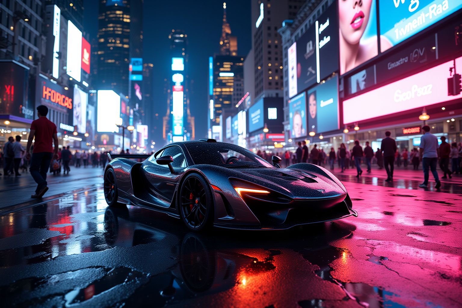 夜幕降臨,一輛黑色跑車在繁華的都市街道上熠熠生輝,成為畫面中最引人注目的焦點。這輛車停在路右側,車頭朝向我們,略微領先一群正在走過的行人。跑車的設計亮點在於尖銳的車頭和尾翼,賦予其流暢動感的造型。車頭醒目的紅燈條為黑色車身增添了一抹亮色。照片中無法看到車牌。背景中,高樓林立,廣告看板林立,構成了一幅壯麗的城市景觀。這些建築高聳入雲,營造出一種縱深感和空間感。夜空漆黑,顯示此時已是夜晚。從照片的整體構圖來看,這或許暗示著一個都市場景,考慮到街上行人的存在,可能正在進行某種特別活動或夜間活動。跑車的位置和方向表明,它可能只是短暫停留,之後便繼續穿梭於城市之中。