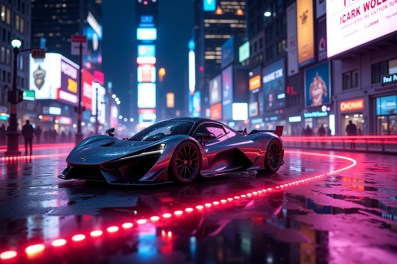 夜幕下,一輛跑車在燈光的襯托下熠熠生輝。這幅畫面捕捉了動感與色彩交織的瞬間,背景是繁華的夜色都市。畫面中央是一輛線條流暢的黑色跑車,其光亮的車身反射著城市夜景的璀璨燈光。跑車行駛在一條紅色霓虹燈閃爍的街道上,燈光強度彷彿剛經歷過一場暴雨。雨後的街道濕滑閃亮,與周圍耀眼的城市燈光交相輝映。這些燈光在畫面上暈染出粉紅色、藍色、黃色和綠色的絢麗色彩,形成鮮明的對比,更凸顯了跑車的黑色輪廓。在夜空的映襯下,遠處建築的輪廓清晰可見。其中一個招牌格外引人注目——“獅子王”,或許暗示著附近有劇院或娛樂場所。整幅畫面的構圖展現了一個充滿活力、色彩繽紛的都市景象。