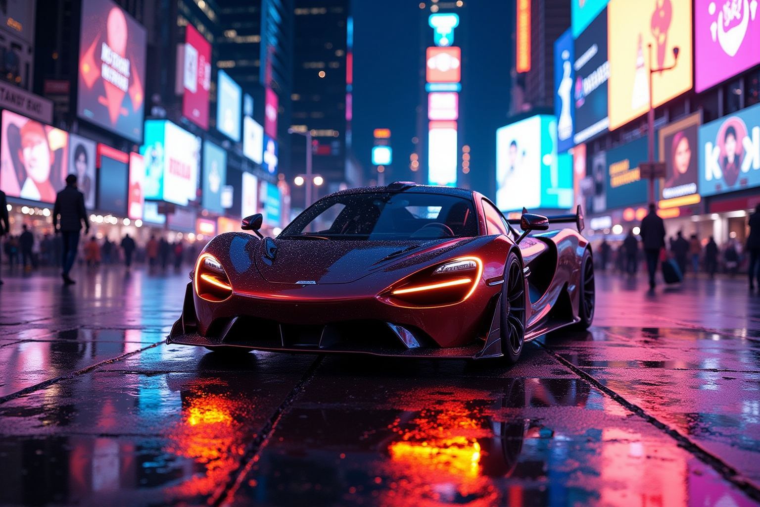 夜幕下的跑車,燈光閃耀。這張照片捕捉了夜色中城市街道的活力景象。畫面中最引人注目的是一輛線條流暢的紅色麥克拉倫P1跑車,其尖銳的車頭和棱角分明的車身在環境燈光的映襯下更顯突出。這輛車平行停放在熙熙攘攘的人行道旁,旁邊有一個水坑,水坑裡映照著它的倒影。街道本身就是一幅都市生活的壯麗景象,高聳入雲的摩天大樓鱗次櫛比。它們的立面裝飾著耀眼的廣告牌,五彩繽紛的燈光為整個場景增添了光彩。路上行駛的車輛為這幅夜景注入了動感。儘管周圍熙熙攘攘,麥克拉倫P1依然格外醒目,它的紅色與周圍單調的城市景觀形成了鮮明的對比。它位於畫面中心,立刻吸引了觀者的目光,使其成為畫面中無可爭議的焦點。畫面中沒有任何可辨識的文字,物體之間的相對位置暗示著典型的城市佈局:道路兩側林立著建築物。汽車靠近人行道和水坑,表示它只是停過或即將離開。總而言之,這幅畫面捕捉了這座不夜城中某個瞬間的景象,即使在夜幕的掩護下,生活依然如常——包括像麥克拉倫P1這樣的高性能跑車所帶來的魅力。
