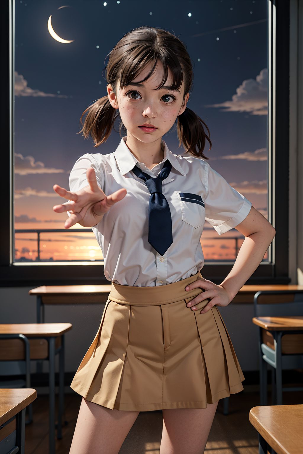 在源靜香(Shizuka Minamoto)作品中,一位綁著雙馬尾、留著瀏海的少女站在窗前。她身穿校服,包括白色襯衫、黑色領帶和卡其色裙子。她舉起左手,彷彿在向窗外的人揮手。她身後的背景是一輪滿月下的寧靜海景。窗前還擺放著三把木椅,暗示著一個舒適的學習或閱讀區。