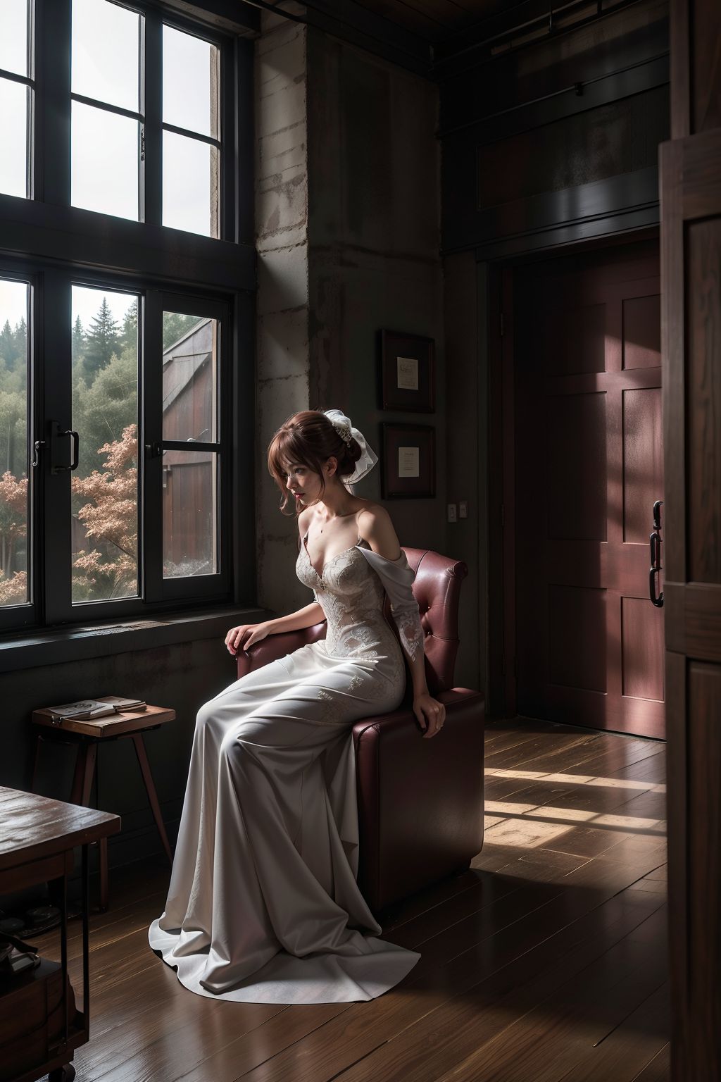 《暗黑婚禮》這張照片捕捉了一間房間內寧靜的景象,柔和的陽光透過兩扇窗戶灑進來。畫面中心是一位身穿白色婚紗的優雅女子,她端坐在一張鮮紅色的皮質扶手椅上。她的姿態似乎正沉浸在靜謐的沉思中,或是陷入了某種遐想。她左手扶著扶手,目光向下偏向右側,彷彿被畫面之外的事物所吸引。背景中的窗戶暗示著戶外的景色,但一側垂下的黑色窗簾遮擋了視線。房間本身簡潔溫馨,木地板為空間增添了一絲溫暖。旁邊的小桌上擺放著一朵紅花,或許暗示著某個特殊的場合,或許只是為了美觀。儘管房間裡還有其他物品,但這位女子仍然是畫面的中心,她的姿態和裝束暗示著她可能正在為某個活動或儀式做準備。然而,在沒有更多背景資訊的情況下,這僅僅是基於照片中呈現的視覺線索的推測。每個物體相對於其他物體的精確位置,共同構成了一幅和諧的畫面,引導著觀者的視線在場景中游走。整體而言,這幅圖像捕捉了一個寧靜的瞬間,畫面中心是一位女士,置身於一個裝飾簡潔而雅緻的房間之中。