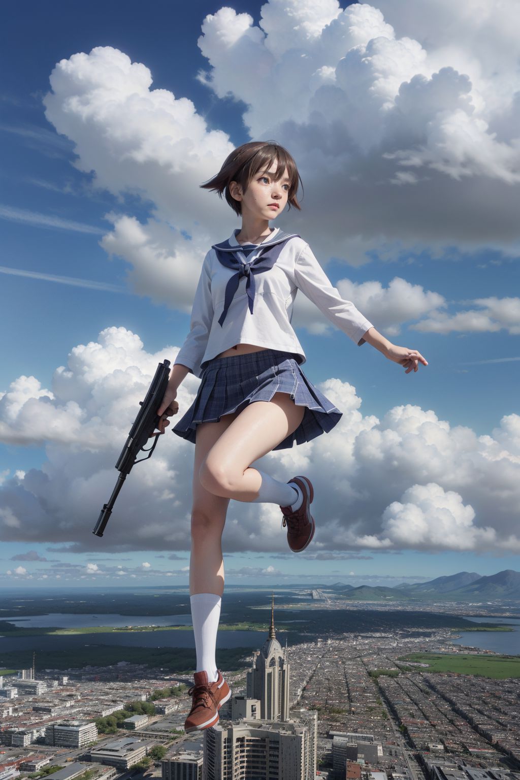 宮藤芳佳,《強襲魔女》。圖中,一位年輕女孩從高樓縱身躍下,懸於半空。她穿著白色襯衫和藍色裙子,右手握著槍。隨著她翱翔,城市景觀在她腳下徐徐展開,高樓大廈綿延至遠方,山脈在陰雲密佈的天空下若隱若現。她瀏海垂在臉頰兩側,襯托出她堅定的神情,自信地向前躍去。