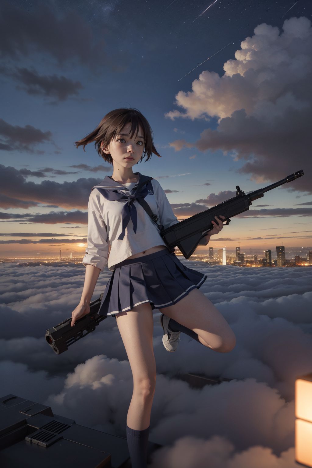 宮藤芳佳,《強襲魔女》,一個站在雲端拿著槍的女孩。