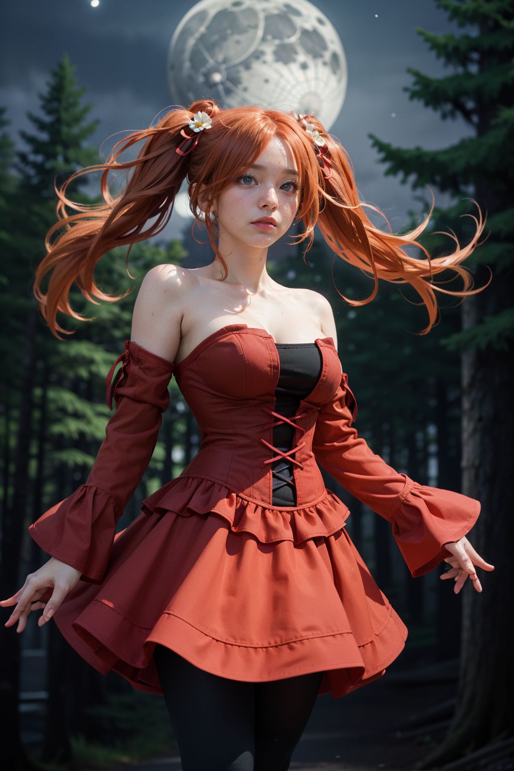 娜塔莉,《史詩戰鬥幻想》:畫面中央,一位擁有鮮豔紅髮的年輕女子邁向大步,姿態動人。她穿著一套引人注目的紅色緊身胸衣和配套短裙,在周圍森林的映襯下格外醒目。一條黑色頸鍊與她火紅的秀髮形成鮮明對比,更添幾分韻味。她並非只是在行走,而是在運動,金色的秀發在她身後飛揚,暗示著她可能正在森林中輕快地穿行。畫面的背景與女子本身一樣引人入勝。她被高聳入雲的樹木環繞,綠葉交織成一幅天然的錦繡,一直延伸到遠方。茂密的森林逐漸過渡到一片開闊的林間空地,一輪滿月高懸夜空,為這片景色灑下柔和的光輝。儘管畫面看似靜止,卻蘊含著一種動感——從女子飄逸的秀發到周圍寧靜而神秘的森林,無不如此。她彷彿在與風賽跑,或許在追逐一個難以捉摸的夢想。頭頂的月亮增添了一絲神秘感,暗示著這瞬間定格在黎明之前。總而言之,這幅畫面描繪了一位年輕女子踏上旅程,被自然環繞,唯有月光指引方向。這是一幅捕捉轉瞬即逝的瞬間的快照,充滿了生機與動感。