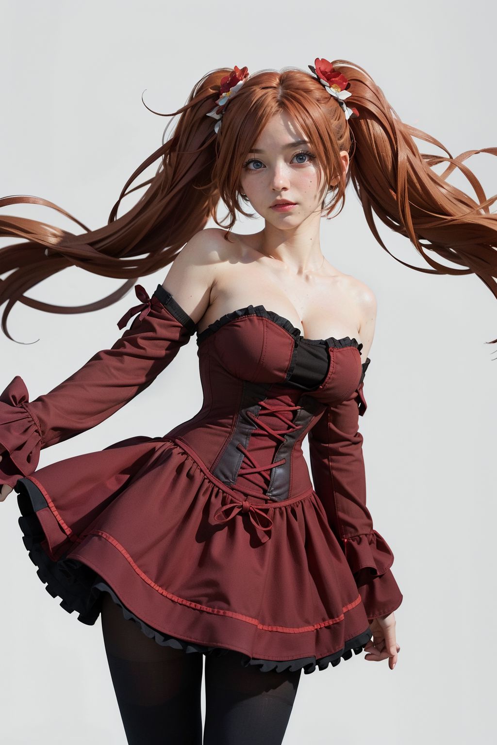 娜塔莉,《史詩戰鬥幻想》,白色背景中央,一位年輕女子自信地站著。她棕色的長髮如瀑布般傾瀉而下,與純白的背景形成鮮明對比。一對紅色蝴蝶結點綴著她的髮間,為她的裝扮增添了一抹亮色。她身穿一件鮮豔的紅色連身裙,與頭上的蝴蝶結相呼應。連身裙飾有黑色蕾絲花邊,腰間繫著一個與之相配的黑色蝴蝶結,整體造型引人注目。她的姿態彷彿隨時準備拍攝照片或表演,展現出一種時尚自信的氣質。畫面中沒有任何文字或其他可辨識的物體。女子、她的洋裝和配件是這幅畫作的焦點。