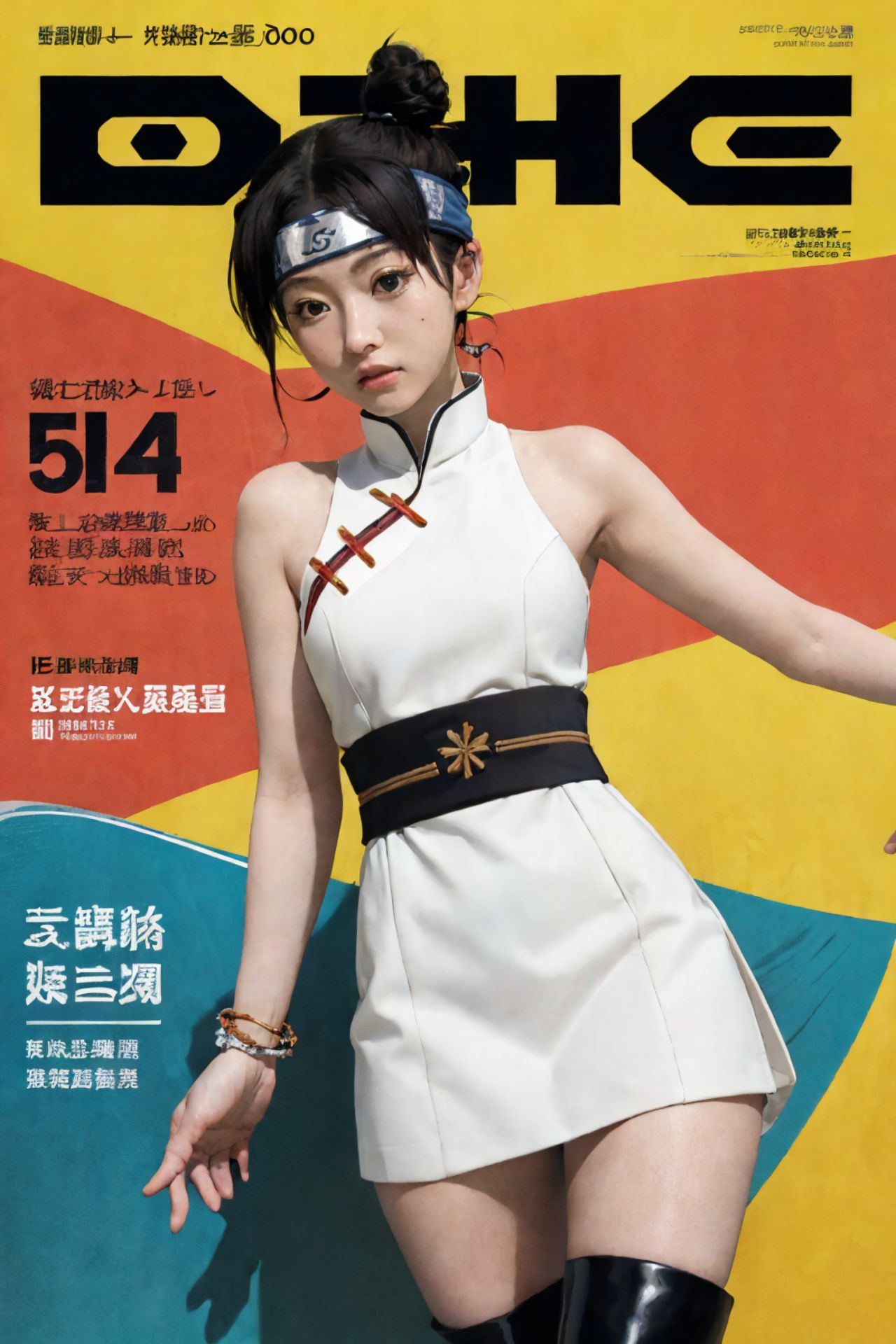 天天,鳴人,這幅圖的主角是一位年輕女子。她有著深色的頭髮,頭上戴著一條飾有紅色花朵的黑色髮帶。她身穿白色連身裙,搭配金色腰帶和黑色過膝長靴。她擺出一個充滿動感的姿勢,踮起腳尖,一隻手臂向後伸展,彷彿在碰觸什麼。女子的表情嚴肅,為畫面增添了一絲緊張感。她所處的背景是充滿活力的藍黃相間。背景上有一些漢字,但僅憑圖片無法辨認其具體意義。圖片所屬的雜誌是《D-Style》,圖片中的文字也印證了這一點。期號為514,表示這篇文章或這幅圖可能出自該期雜誌。總而言之,這張圖捕捉了《D-Style》雜誌中中國風場景下,女子充滿張力和時尚感的瞬間。